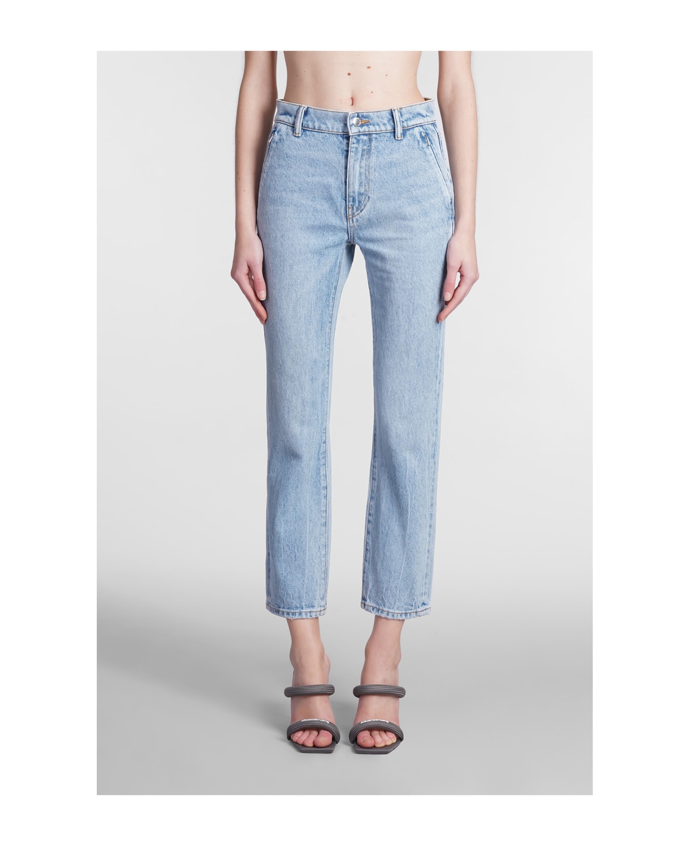 Jeans in cyan denim, button and zip closure, waist belt loops, five pockets, 100% cotton, Made in China, Model is 180 cm and wears size 26