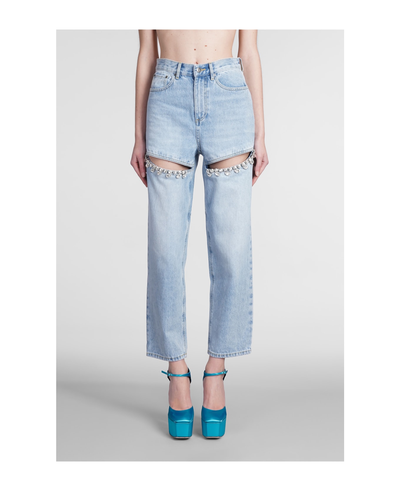 Jeans in cyan denim, waist belt loops, button and zip closure, five pockets, cut out detail, cristal details, 100% cotton, Made in China, Model is 180 cm and wears size 26