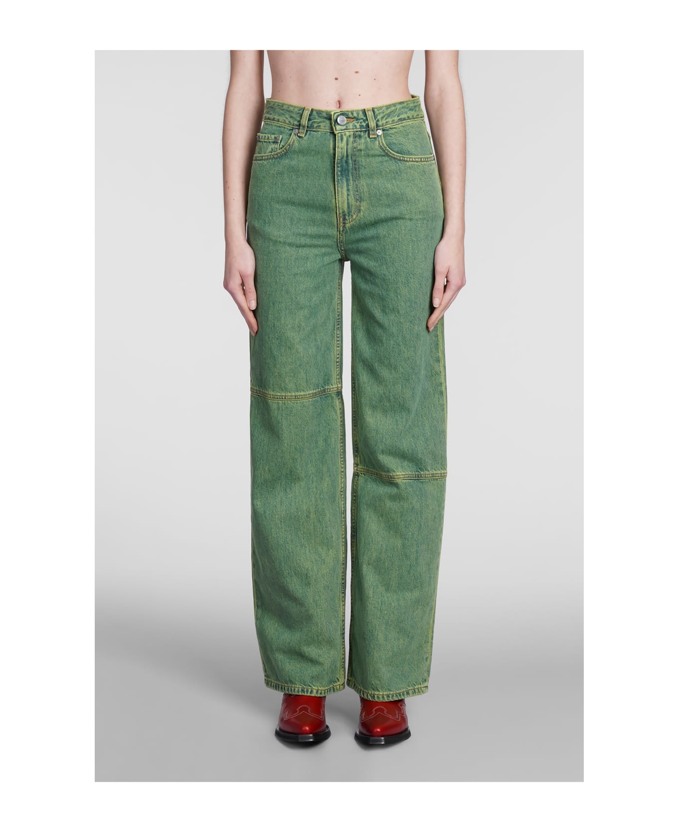 Jeans in green denim, button and zip closure, five pockets, 100% cotton, Made in Turkey, Model is 180 cm and wears size 26