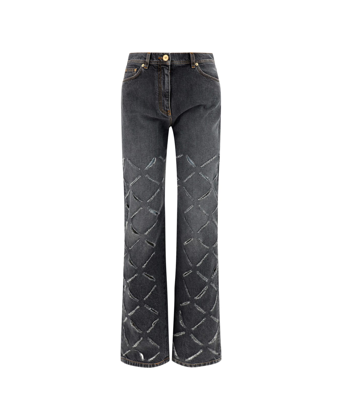 Cotton jeans by gianni versace, front button and zipper closure, five-pocket straight style, waistband loops, leather patch with iconic brand signature pressure-printed applique on back, all-over worn-effect rhombus details on legs. Composition: 100% % Cotton