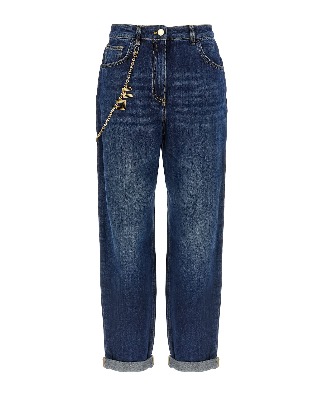 Stonewashed cotton denim jeans with crop style with turn-up hem, egg construction, removable jewel chain, front zip and button closure, five pockets, back logo tag. Composition: 100% cotton