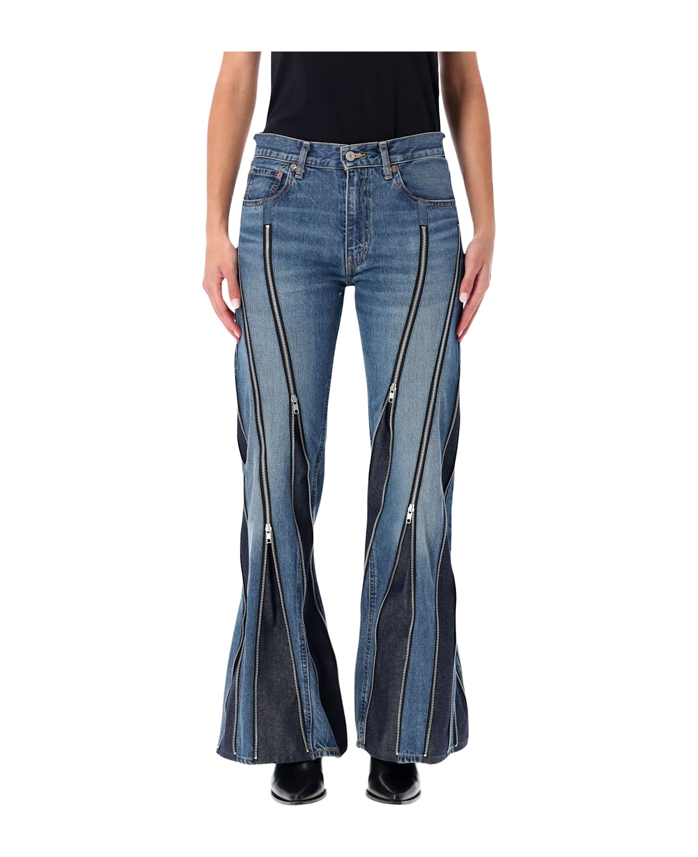 These Denim Jeans By Junya Watanabe Are A Bold Statement Of Experimental Design. Crafted From Sturdy Cotton, They Feature A Straight-leg Fit With A Subtle Flared Hem And Are Enriched With Full-length Zippers That Allow Layering And Styling Variations. Combining A Workwear-inspired Attitude With Avant-garde Aesthetics, They Are The Ideal Piece For Striking Urban Looks With A Strong Visual Impact. Button And Zip Fly Closure Classic Five-pocket Construction Contrasting Full-length Zipper Details Regular Fit With Flared Hem Alessandra Is 1,75 M And Wears Size M