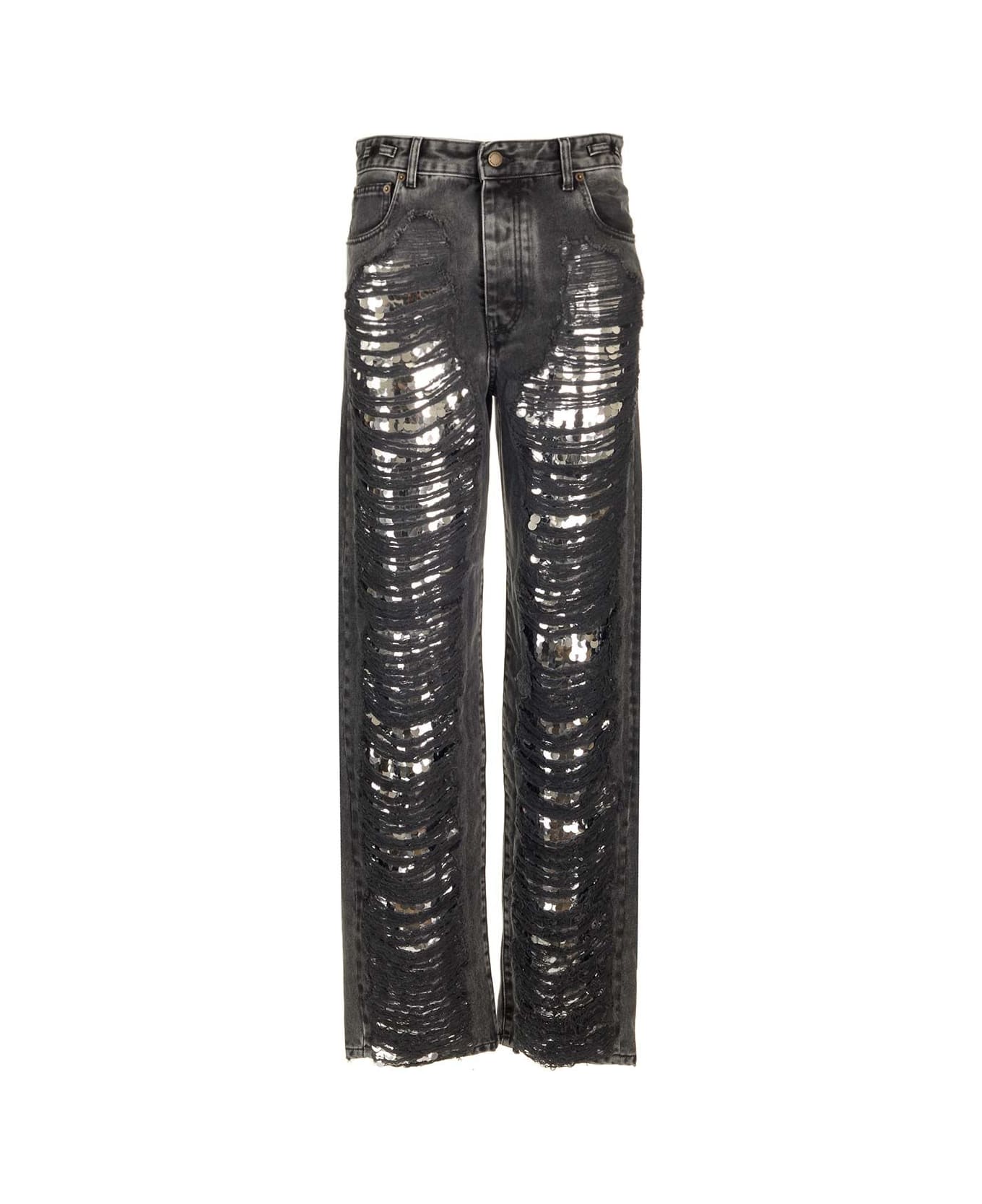 "Karen" denim from Darkpark in black denim with a light gray washed finish, with tears embellished with crystal decorations, 5 pocket design and relaxed silhouette.