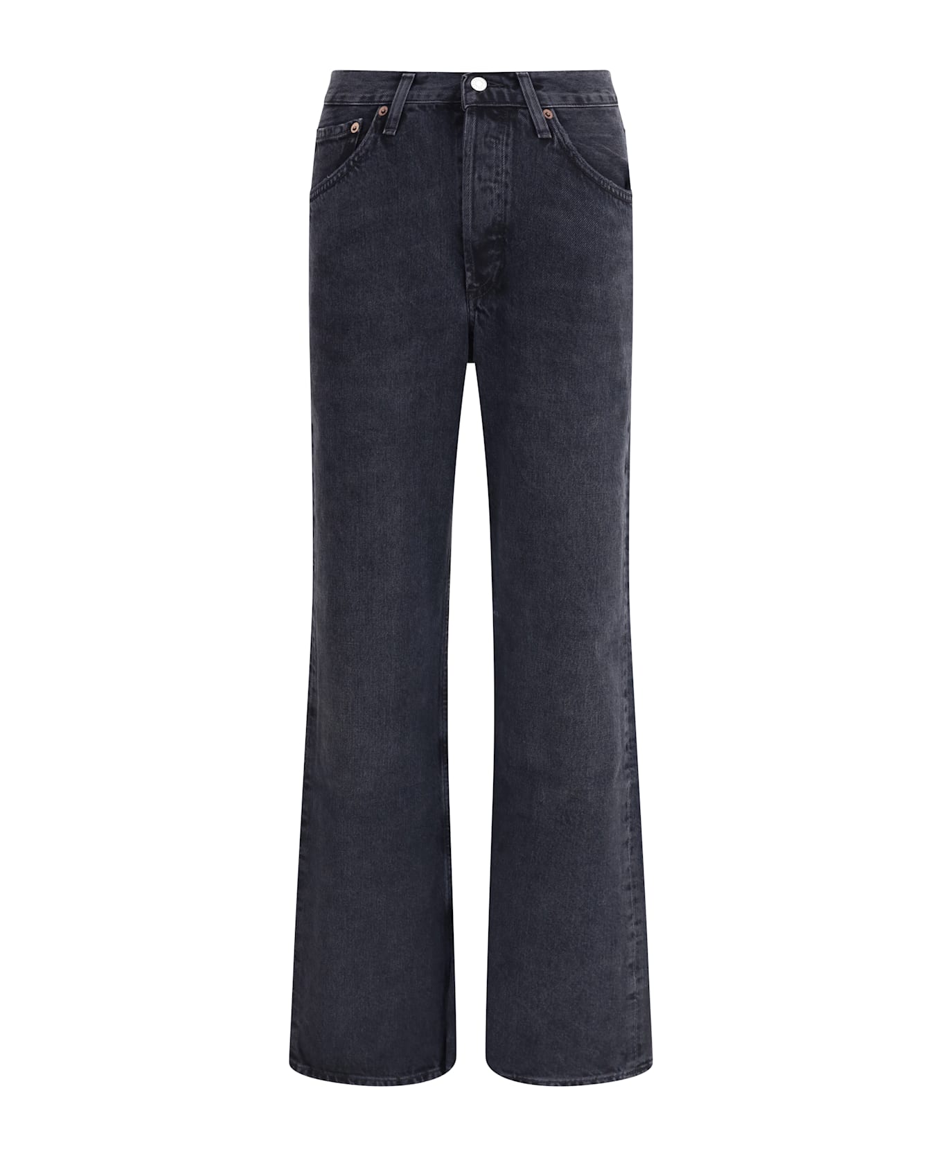 Agolde's kelly jeans offer an essential and modern silhouette, ideal for a casual yet polished look. made according to the classic five-pocket model, they feature a front button closure and belt loops along the waistband. the distinctive detail is precisely the waistband, shaped with a slight v-shape, which enhances the figure and adds a contemporary touch to the design. the straight leg cut makes them versatile and suitable for any occasion.