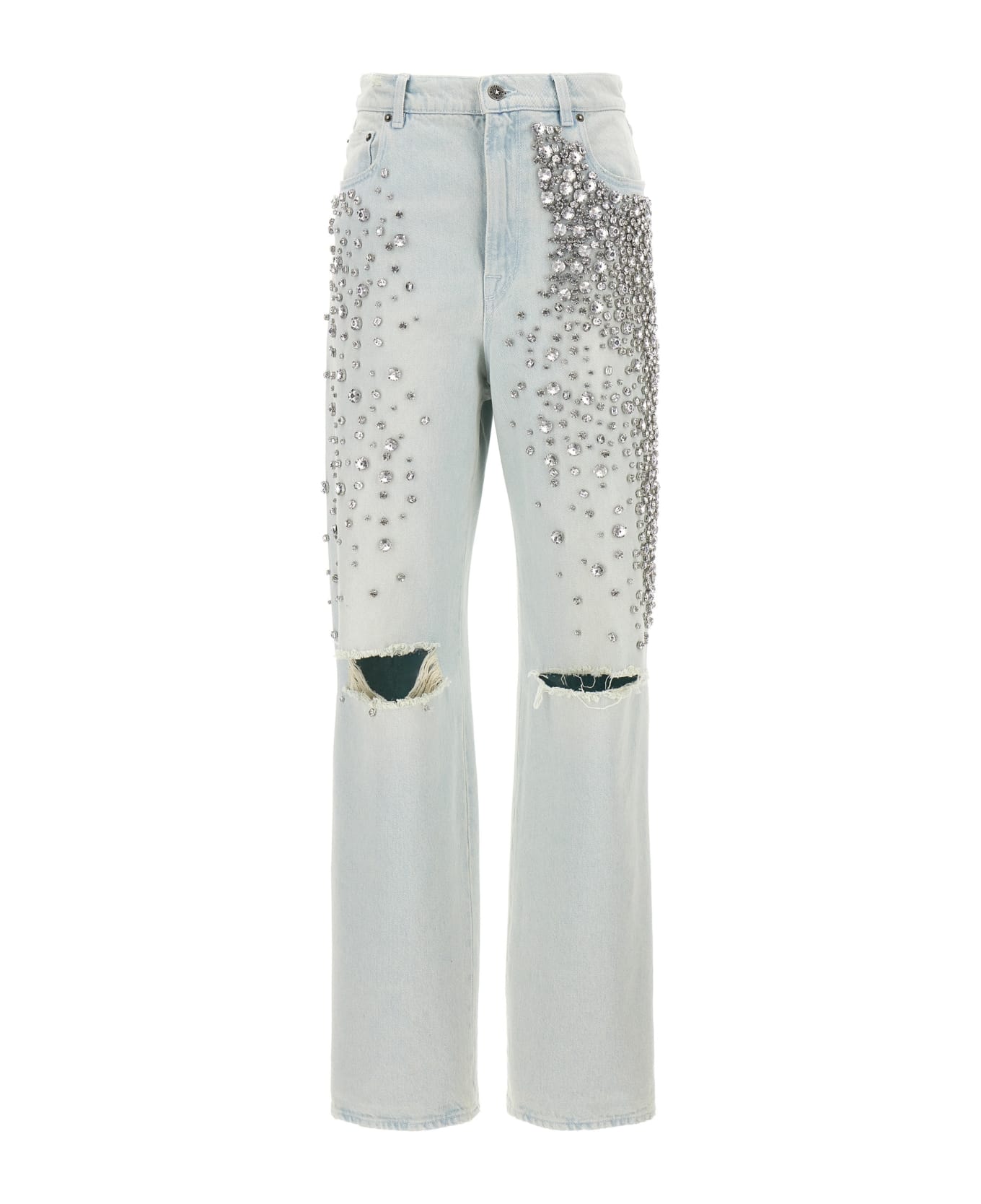 'Kim' cotton denim jeans with distressed details, crystal embellishment, zip and button closure, five pockets.