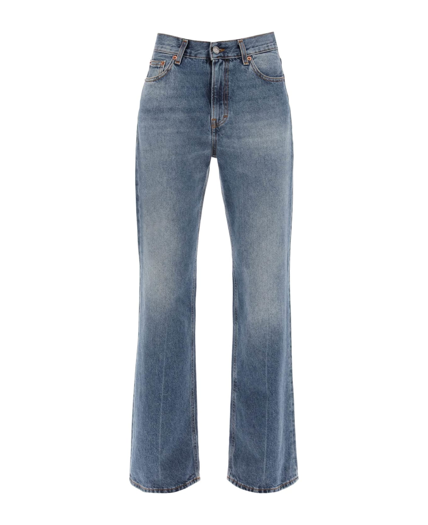 Korea jeans by Haikure crafted in pure cotton denim with Old Blue vintage wash. Five-pocket design characterized by a straight cut featuring front closure with hidden zipper and button and belt loops. Decorated with logoed jacron on the back of the waist. The model is 177 cm tall and wears size 26.