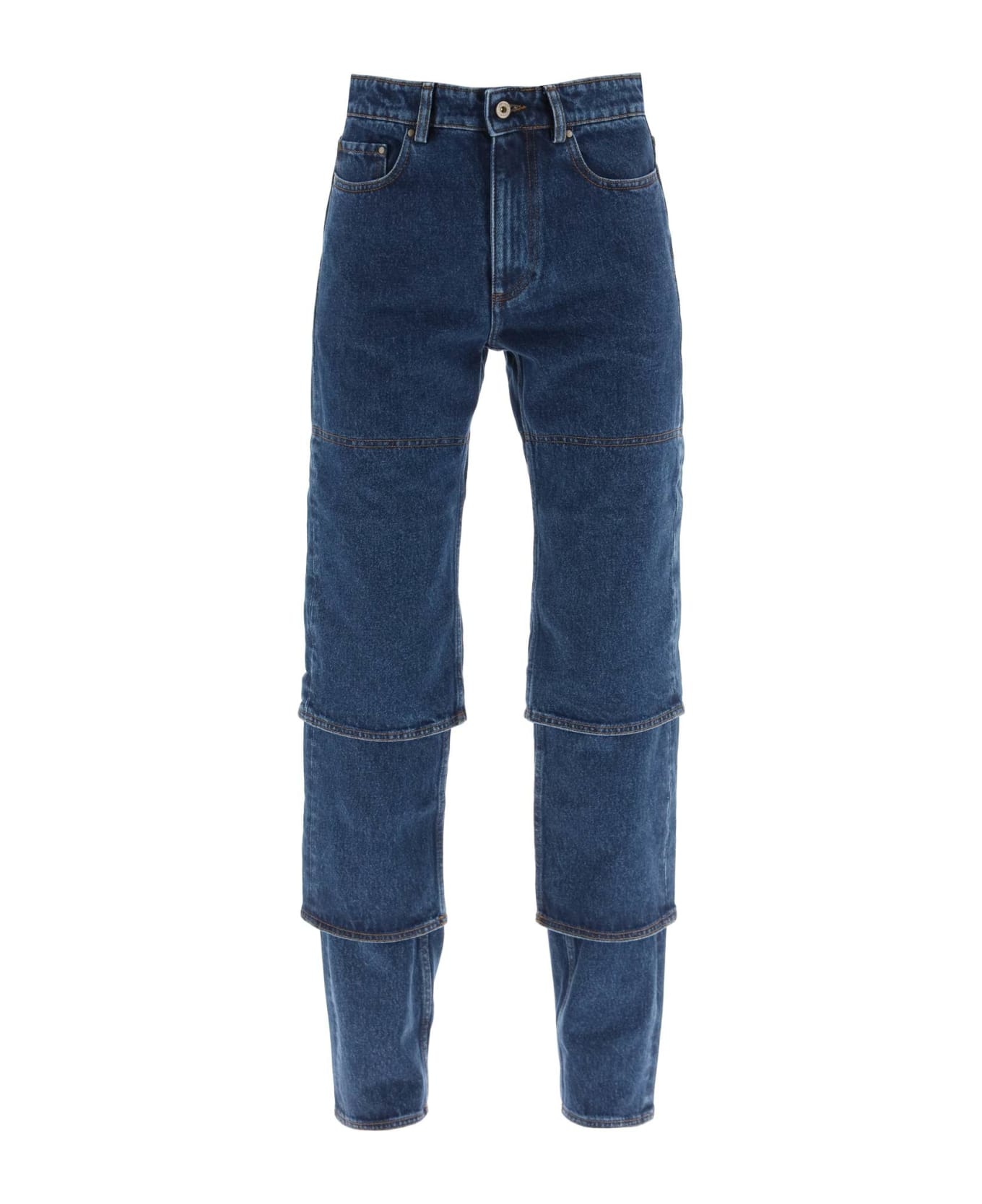 Five-pocket jeans from the Evergreen collection by Y/Project, made of organic cotton denim with a high-waisted loose fit. They feature layered legs with three lengths. Zip fly with branded button, contrast stitching. The model is 177 cm tall and wears a size 26.
