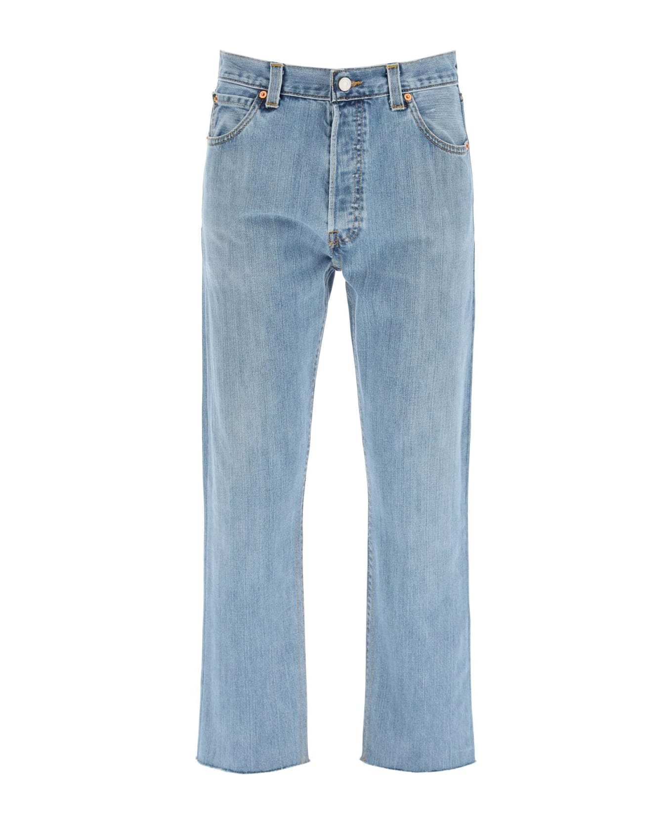Re/Done five-pocket jeans in non-stretch indigo denim, reconstructed from vintage Levi's jeans. High-rise straight-leg fit with raw-cut cropped hem. Button fly, Re/Done jacron on the back waistband, Levi's flag label applied to the back pocket. The model is 177 cm tall and wears a size 26.