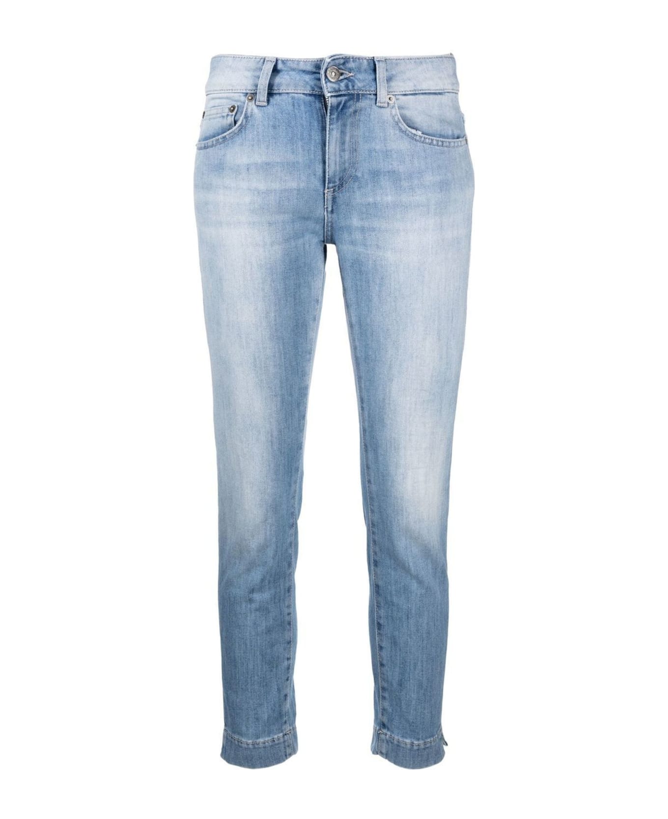 Light blue cotton blend denim jeans, stonewashed, logo patch to the rear, belt loops, front button and zip fastening, classic five pockets, straight leg, cropped leg
