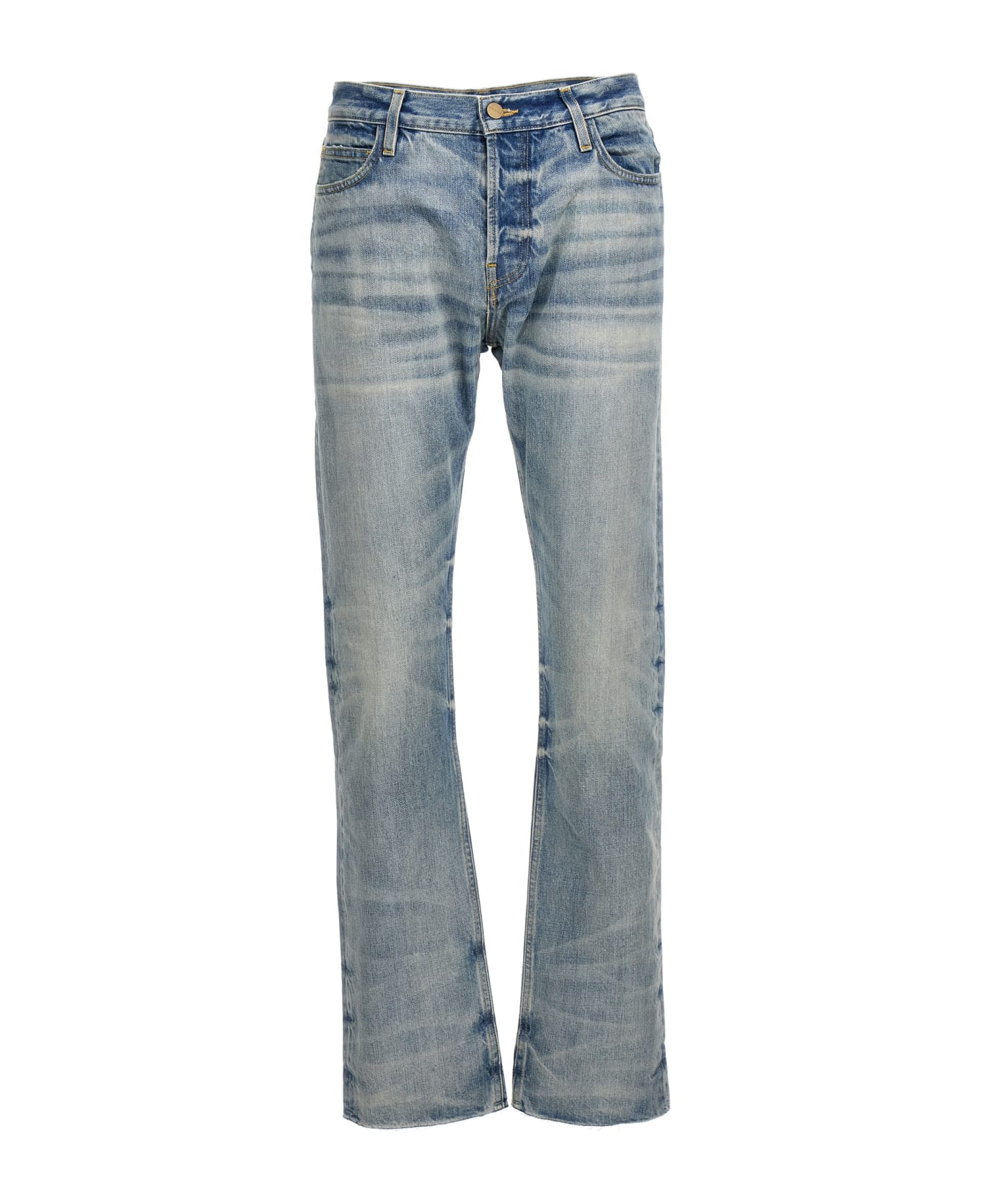 Cotton denim jeans with leather logo patch on the back, button closure, five pockets, and raw cut hem.