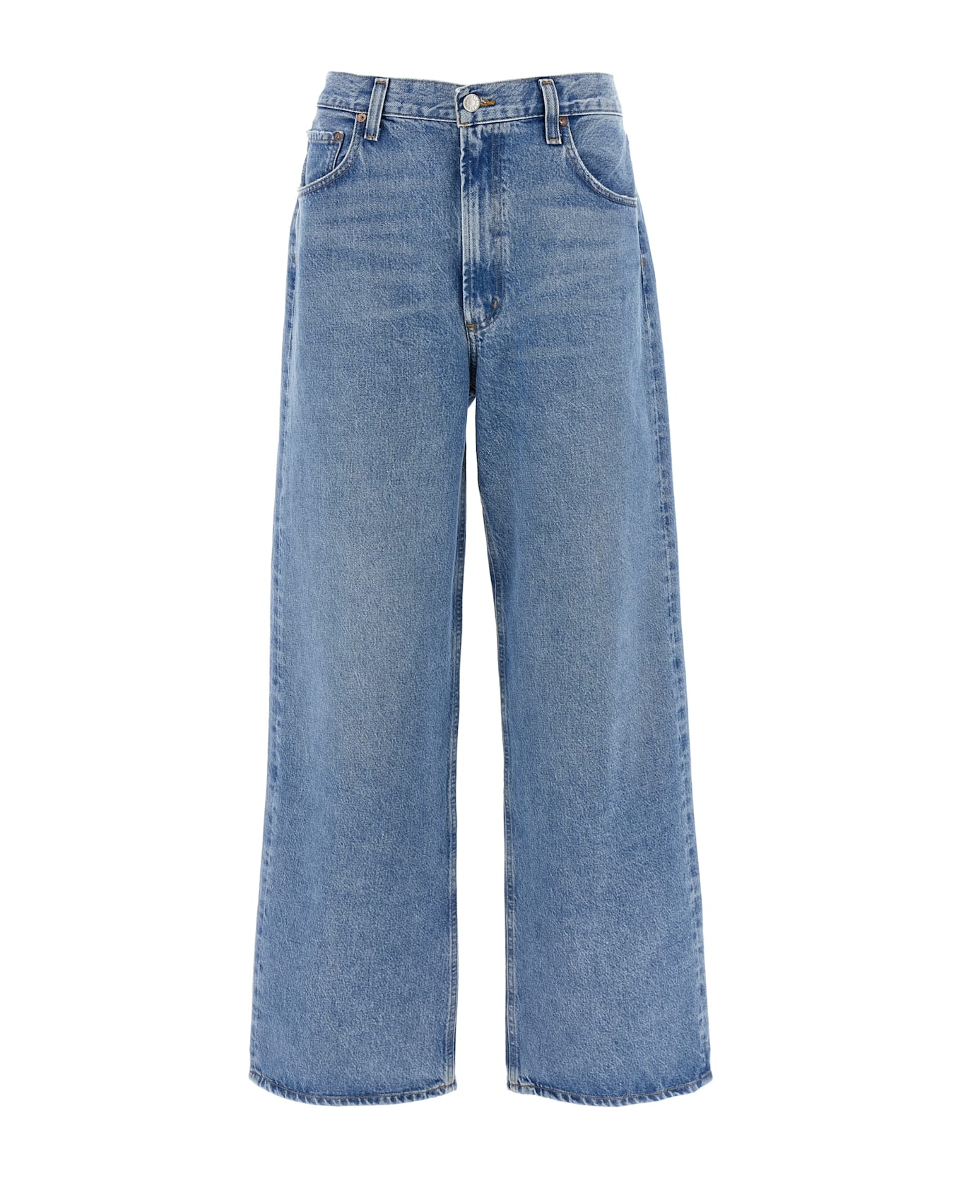 'Low Curve' medium vintage indigo cotton denim jeans with discolorations and burrs, mid-waist model with wide and slightly curved leg, zip and front button closure, five pockets. SUSTAINABLE: This product is made of regenerated cotton.