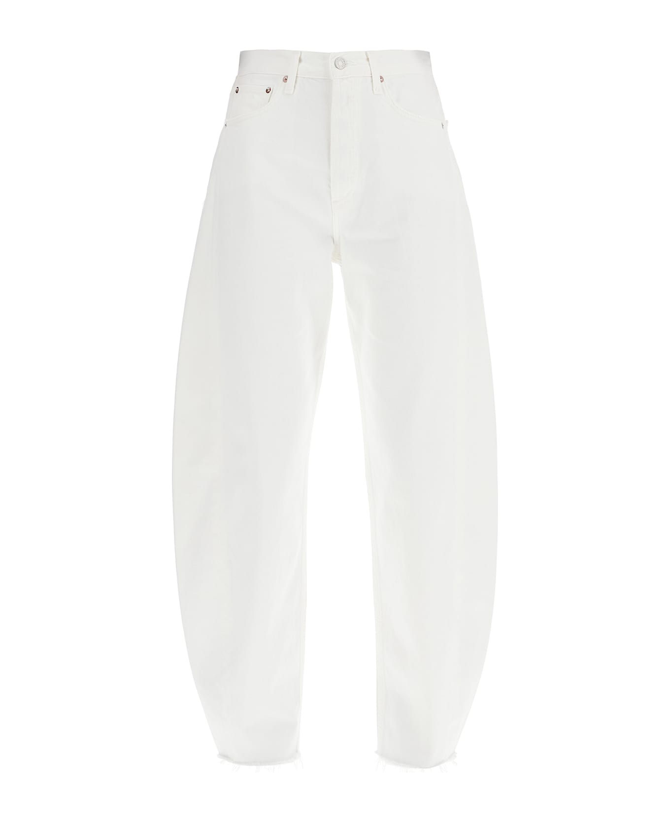 These Agolde five-pocket jeans are made from soft white cotton denim sourced from regenerative agriculture. They feature a relaxed fit with a regular waist and curved leg, enhanced by side inserts. The front closure is hidden with branded buttons, and there are belt loops and a frayed raw hem. The model is 177 cm tall and wears a size 26.