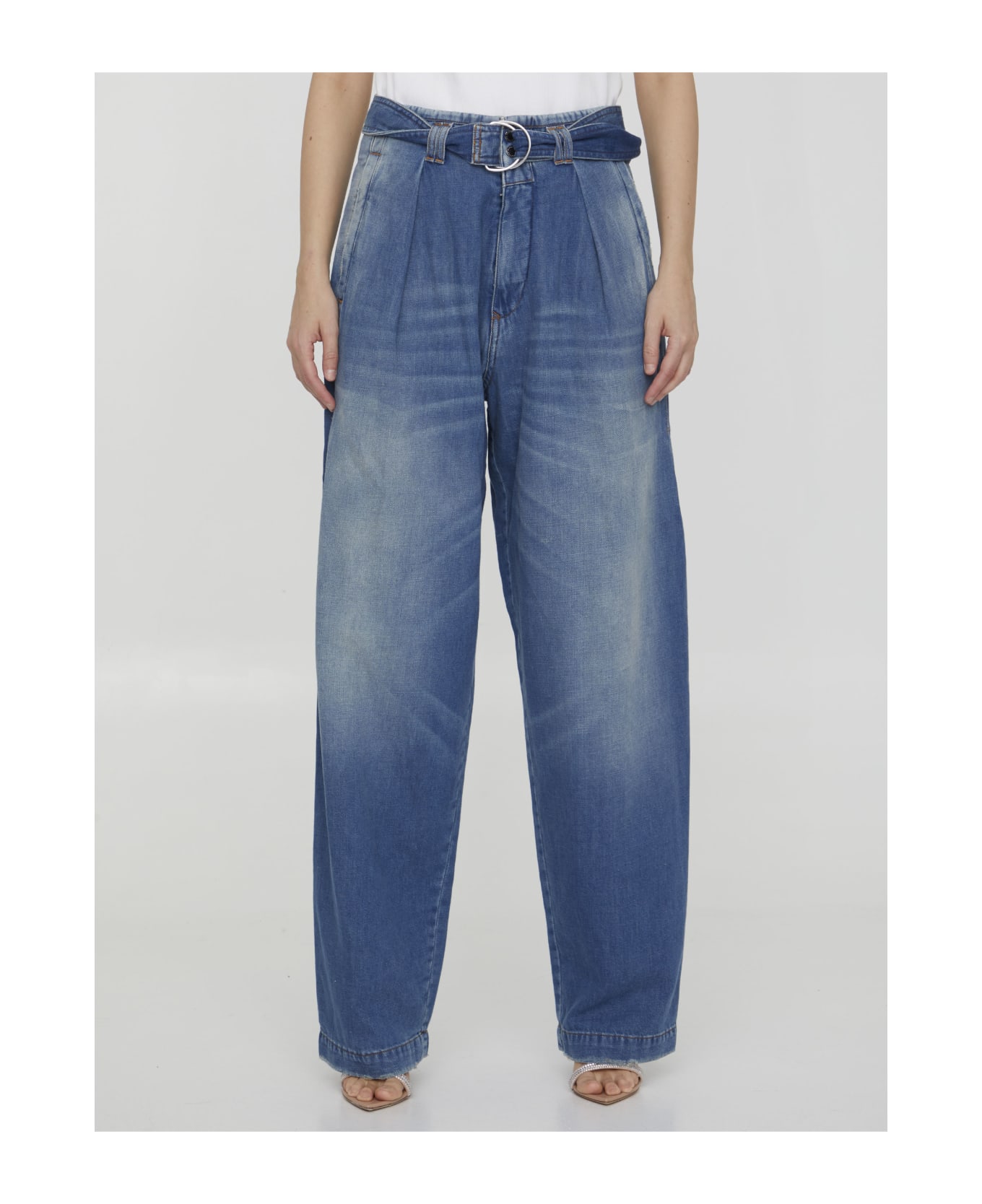 Wide-leg Miriam jeans in blue cotton and linen blend denim with washed-out effect. It features detachable belt on waist, zip and button closure, two side welt pockets and two rear welt pockets. Relaxed fit.