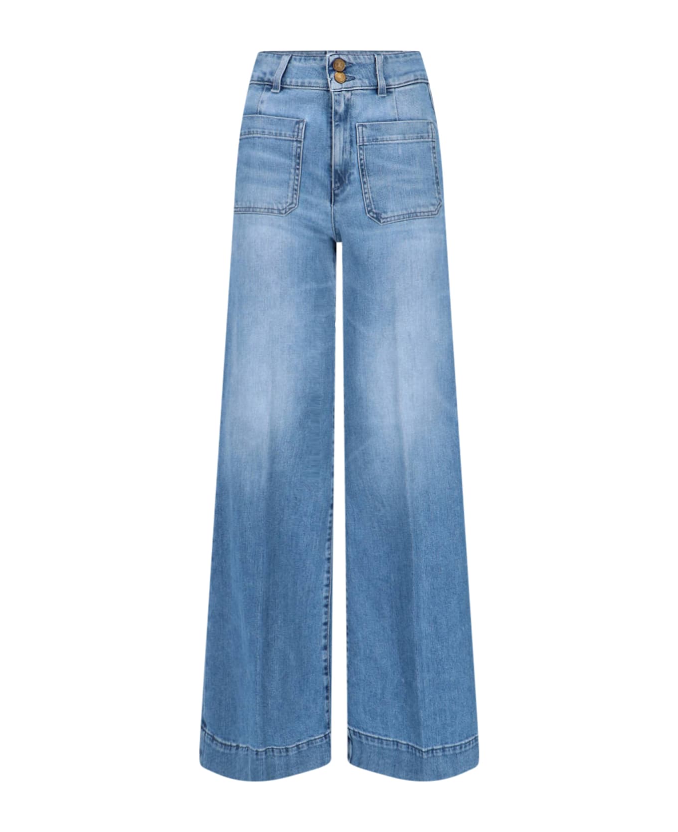 Seafarer palazzo jeans in blue stretch denim with distressed wash, medium waist, belt loops, two-button and zip closure, two flat front pockets, two flat back pockets, two back pleats, flared leg.
