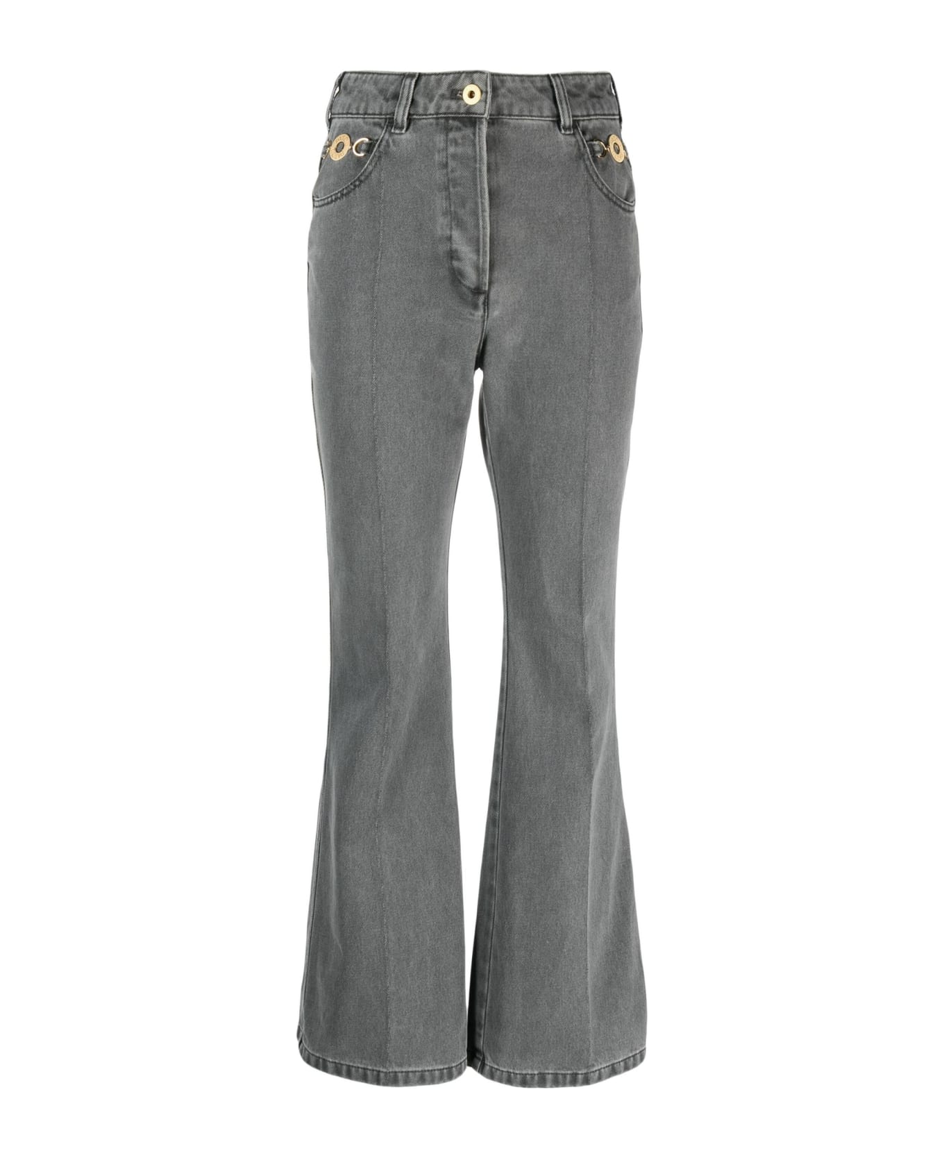 Grey organic cotton denim jeans, logo plaque, gold-tone logo plaque, pressed crease, high waist, belt loops, front button and zip fastening, slip pockets to the sides, flared cuffs