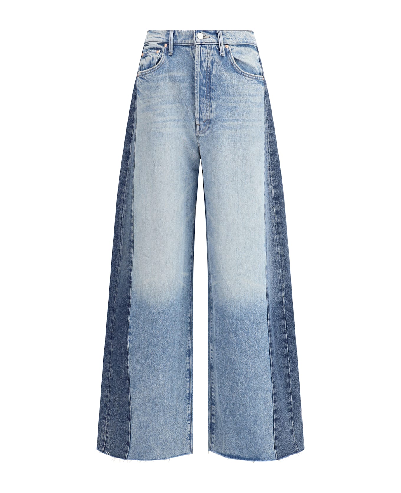 Pipe dream sneak fray jeans by mother denim feature a super high waist and wide leg for a modern, relaxed silhouette. made from stiff denim, they offer a comfortable, structured fit. the wash is a light blue with whiskers and fading at the knees, enhanced by darker inserts along the outer seams. a button flap and frayed hem complete the design for an authentic, contemporary look.