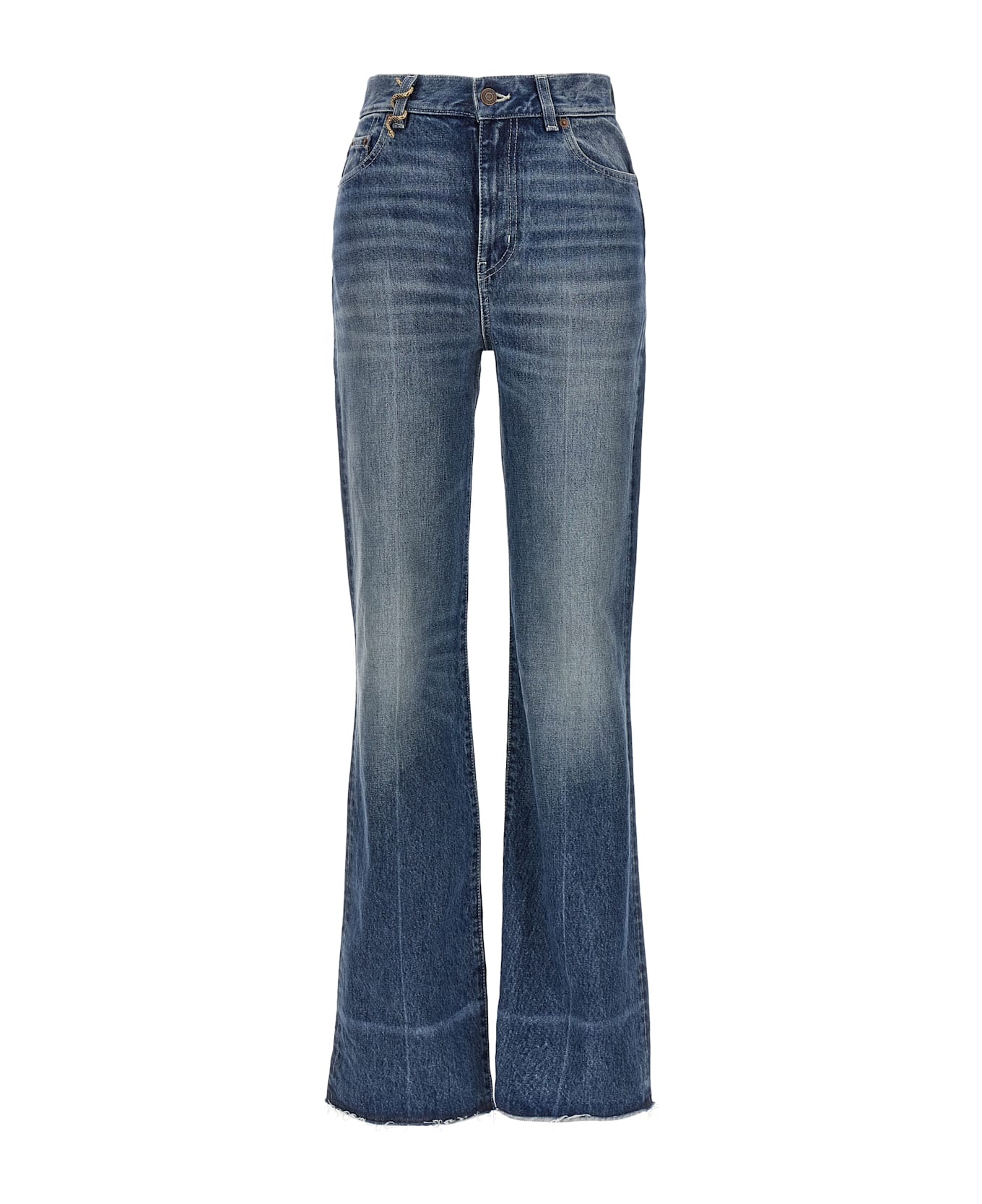 Denim jeans with metal 'serpente' detail, slightly flared leg, raw cut hem, zip and button closure, pockets. Composition: 100% cotton
