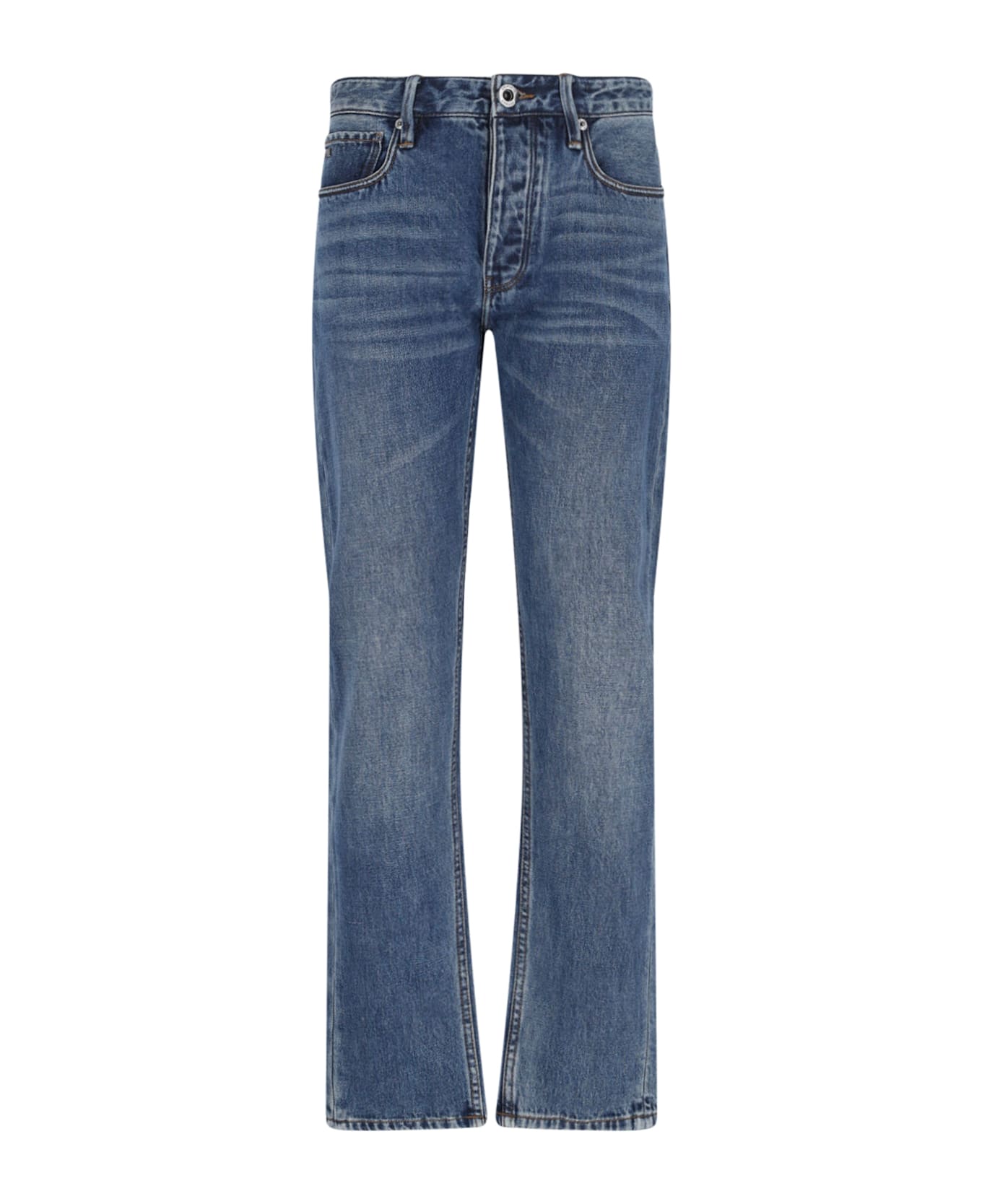 Emporio Armani slim jeans, in blue cotton, usured wash, medium waist, belt loops, button and zip fly, five pocket design, black logo patch on back, straight leg. Composition: 100% Cotton