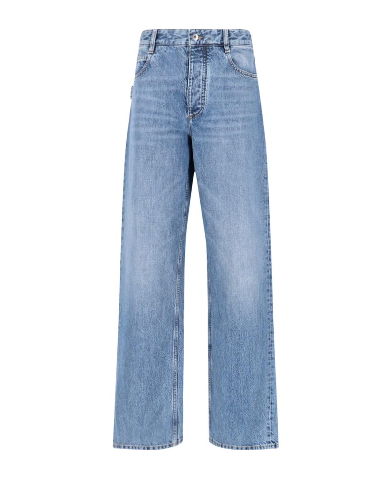 Bottega Veneta Straight Jeans, blue cotton, usured wash, belt loops, button fastening, five-pocket design, green back logo label, denim lace-up detail, straight leg.