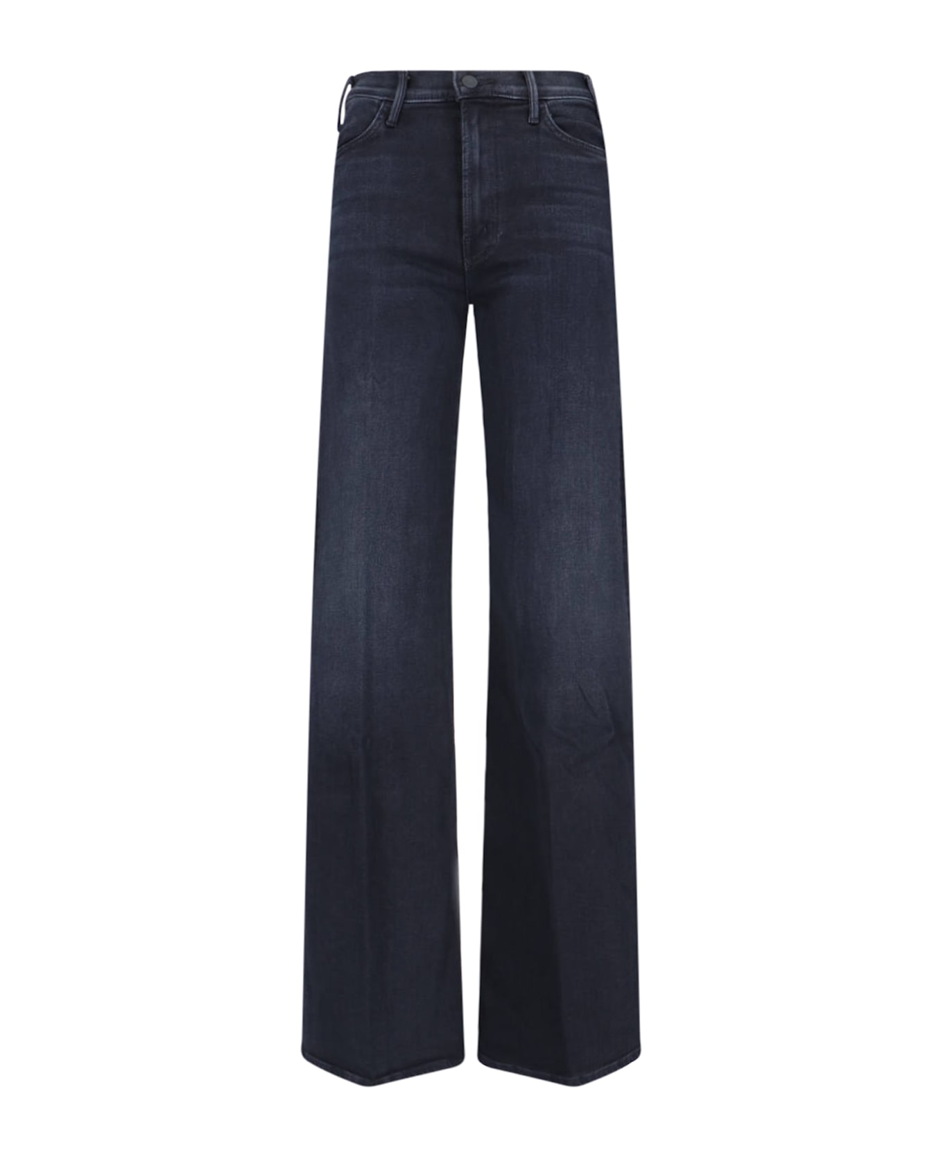 Mother 'The Hustler Roller Sneak' jeans in black denim with high waist, belt loops, button and zip closure, two side pockets, two flat back pockets, back logo label, wide leg.