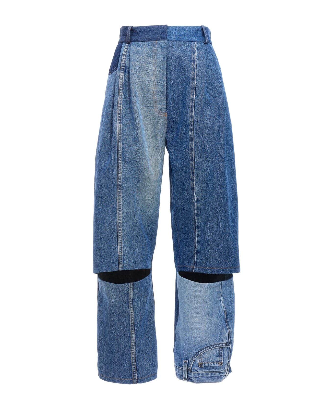 'Upcycled Denim' cotton denim jeans with hook and button zip closure, pockets, pin tucks, cut out detail on the front legs.