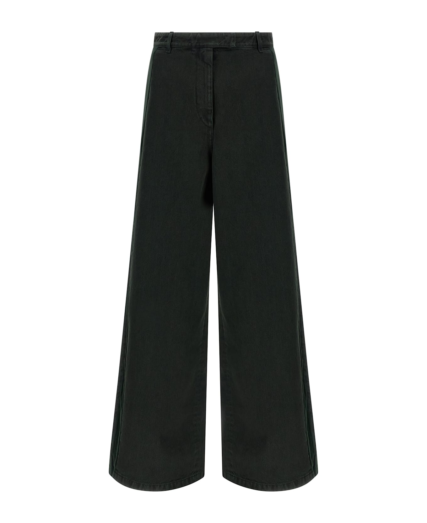 Garment-dyed cotton denim jeans with tone-on-tone velvet side insert, mid waist, wide and straight leg, zip, hook and front button closure, pockets.