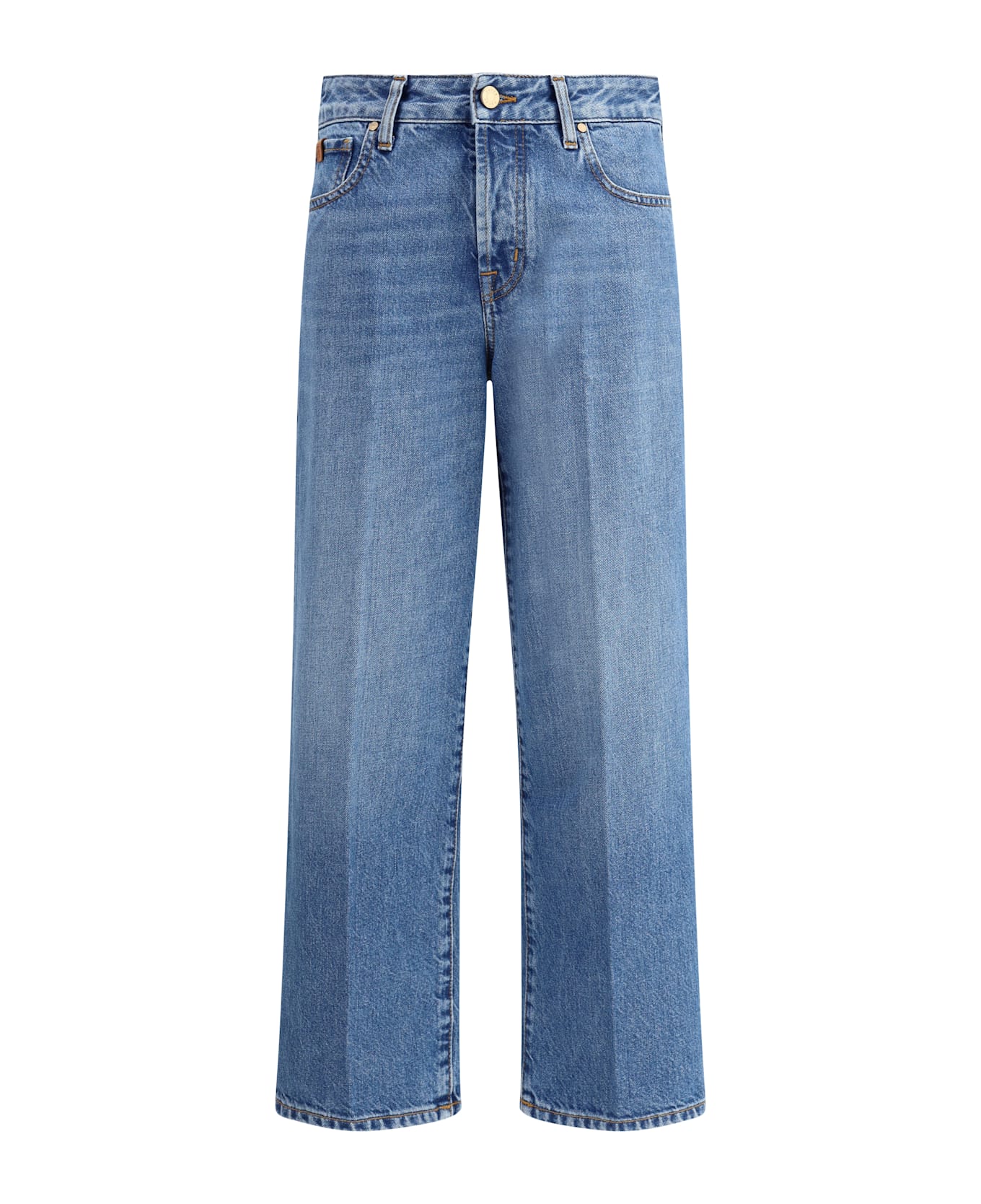 Jacob cohen's 7for cotton jeans combine unique style with a comfortable fit. the boot-cut and wide-leg five-pocket style offers a modern and versatile look, with a mid-rise waist for a classic yet elegant fit. the front closure features buttons, while belt loops at the waistband allow you to customize the fit. the iconic leather patch with the brand's signature pressure print on the back adds a distinctive, high-quality touch to the garment. perfect for those seeking comfort without sacrificing sophistication.