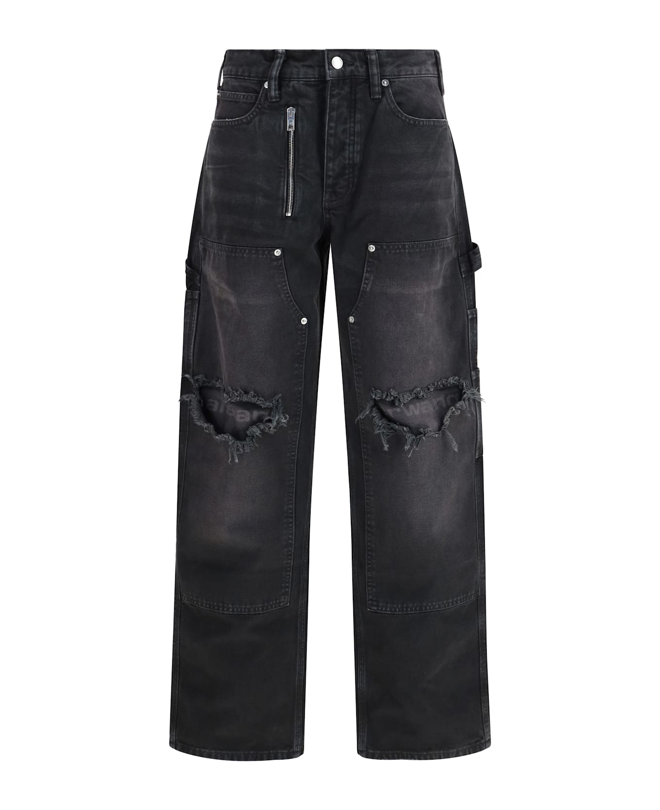 The zip carpenter pants by alexander wang redefine the classic mid-rise work pant with a contemporary edge. zip details introduce tension and structure to the traditionally loose silhouette, enhancing its bold character. a design that merges utility aesthetics with an urban attitude while maintaining a relaxed yet structured fit.