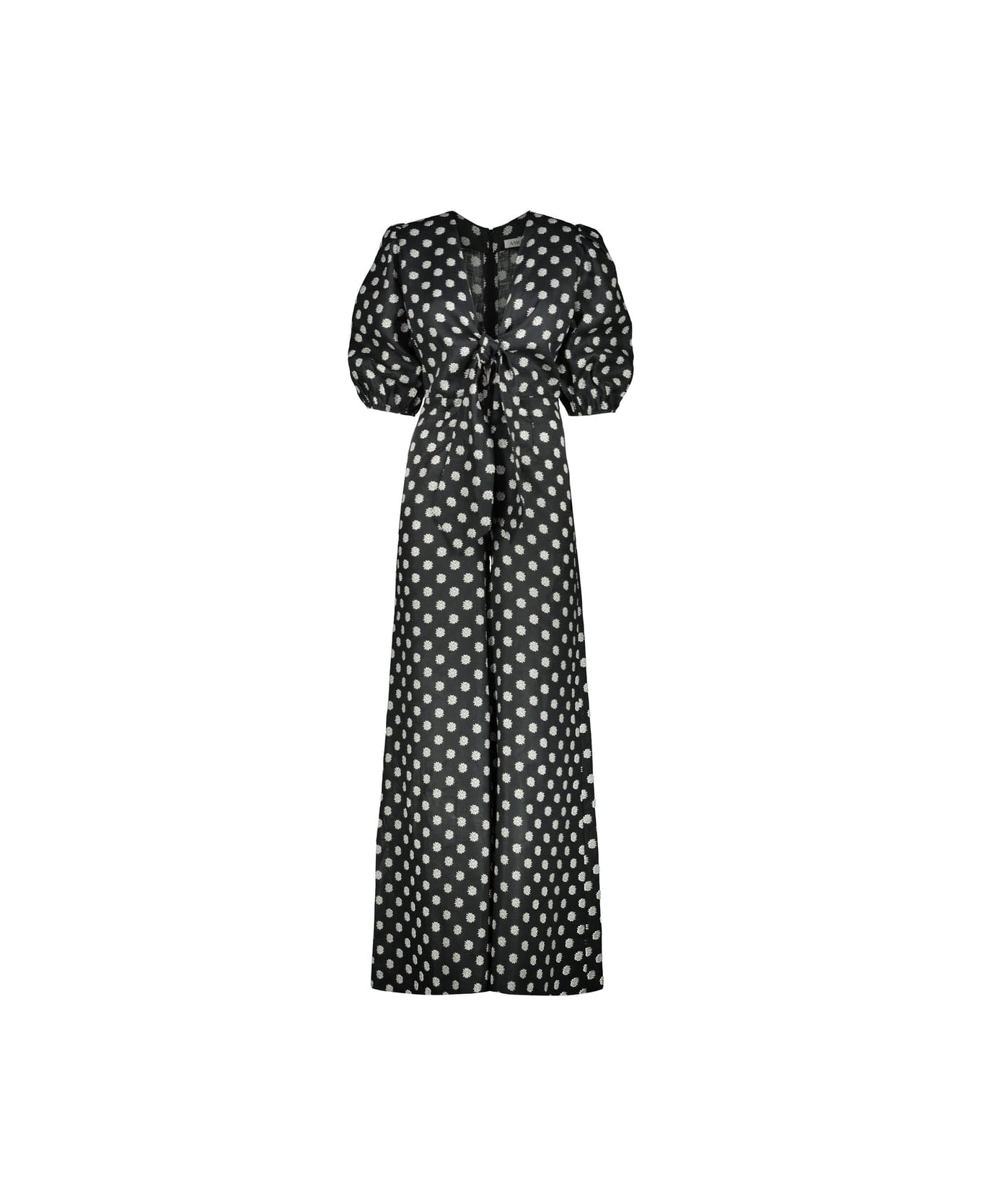 Signature "Allegra" long jumpsuit featuring plunging V-neckline ending in a front knot and puff sleeves. The fitted bodice is emphasized by a waistbelt.