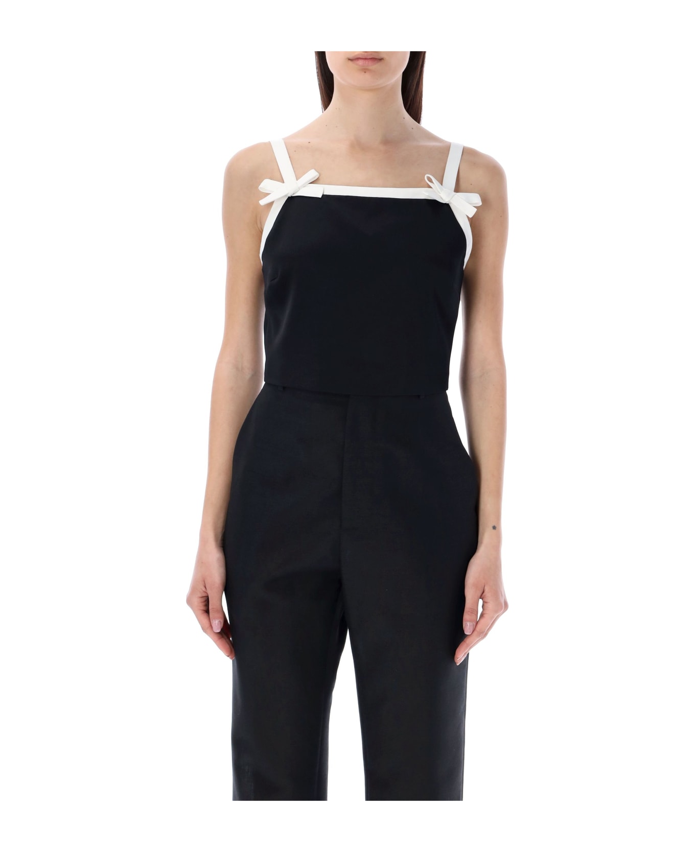 Viscose Bow Crop Top By Msgm. Featuring: Contrasting Shoulder Straps Bow Details At Straps On Front And Back Rear Zip Fastening Cropped Model Is 1,72 M Tall And She Is Wearing Size 40