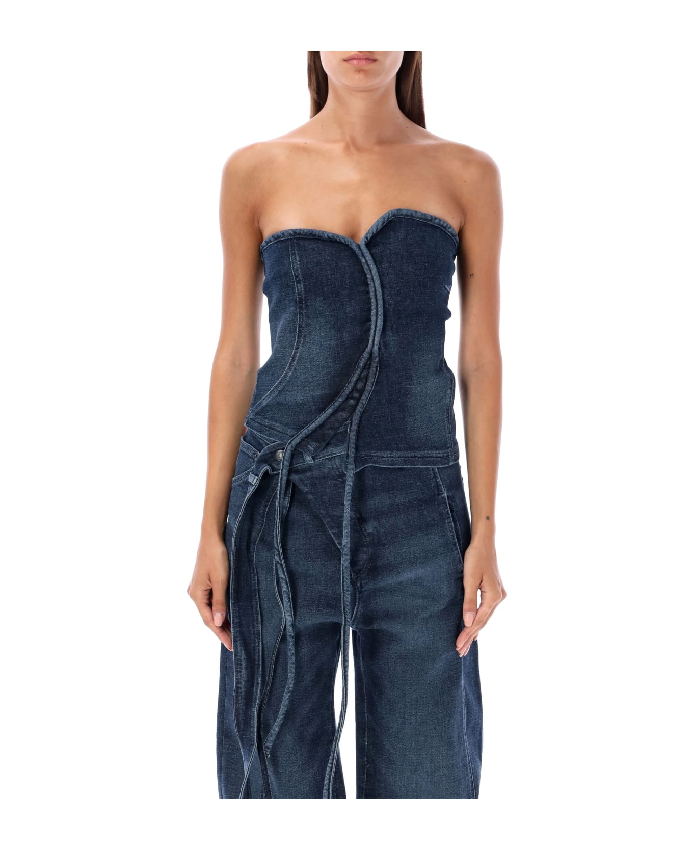 Bustier Denim Top By Ottolinger. Featuring: Denim Sleeveless Top Front Diagonal Zip Back Zip Closure Asymmetric Collar Decorative Pendants In Front Model Is 1,72 M Tall And He Is Wearing Size S