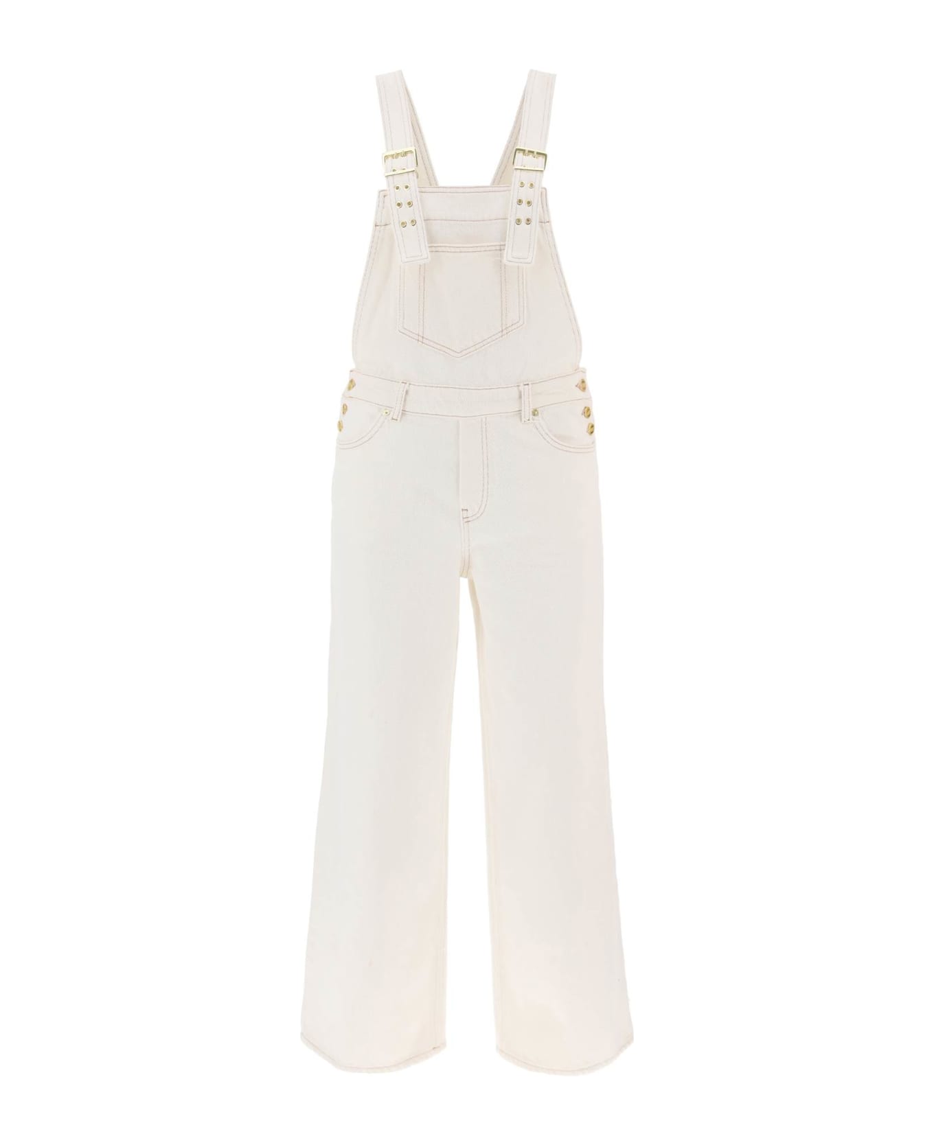 Ganni's overalls are made of heavy organic cotton denim with contrasting stitching. They feature adjustable straps with gold-finished metal buckles, a patch pocket on the chest, French pockets on the sides, and additional applied pockets on the back adorned with a fabric logo label. The design has a wide leg and relaxed fit. The model is 177 cm tall and wears a size EU 34. Composition: 100%CO-O