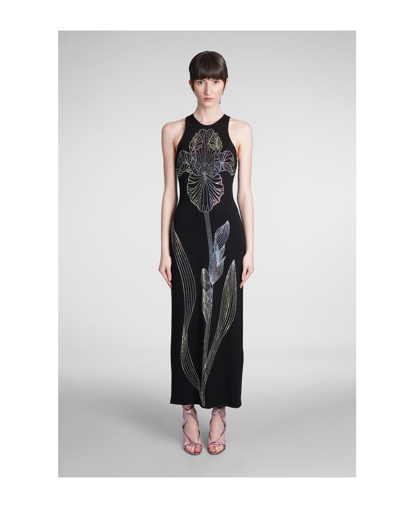 Dress in black viscose, round neck, sleeveless, floreal embrodery, crystals detail, zip clousure, 60% viscose, 5% Elastan, 35% polyamide, Made in Uk, Model is 180 cm and wears a size 10