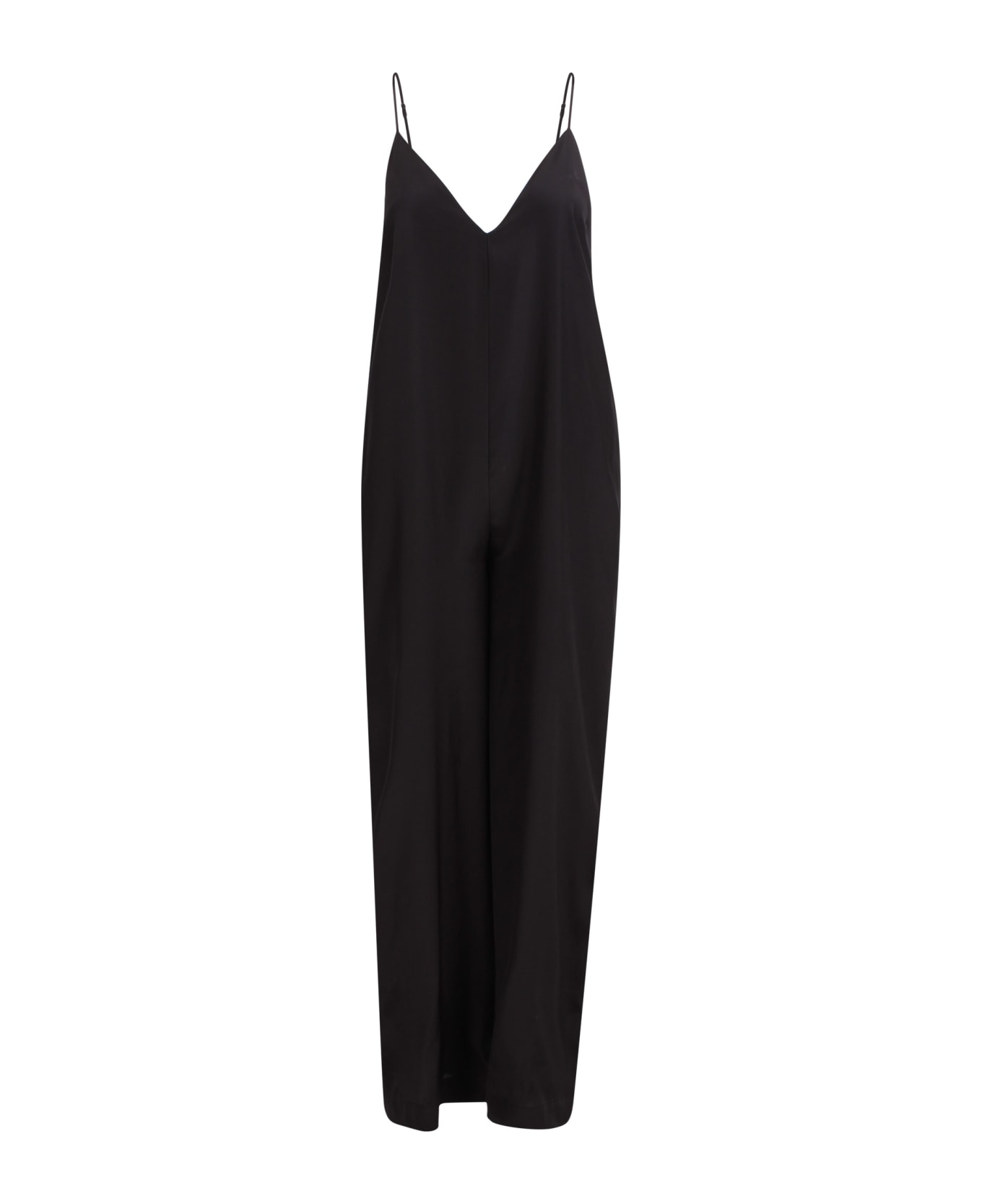 Black silk wide-leg jumpsuit, cut on bias, v-neck, side seam zipper, side seam pockets, adjustable straps, by Gold Hawk Composition: 100% Silk; Lining:, 100% Polyester