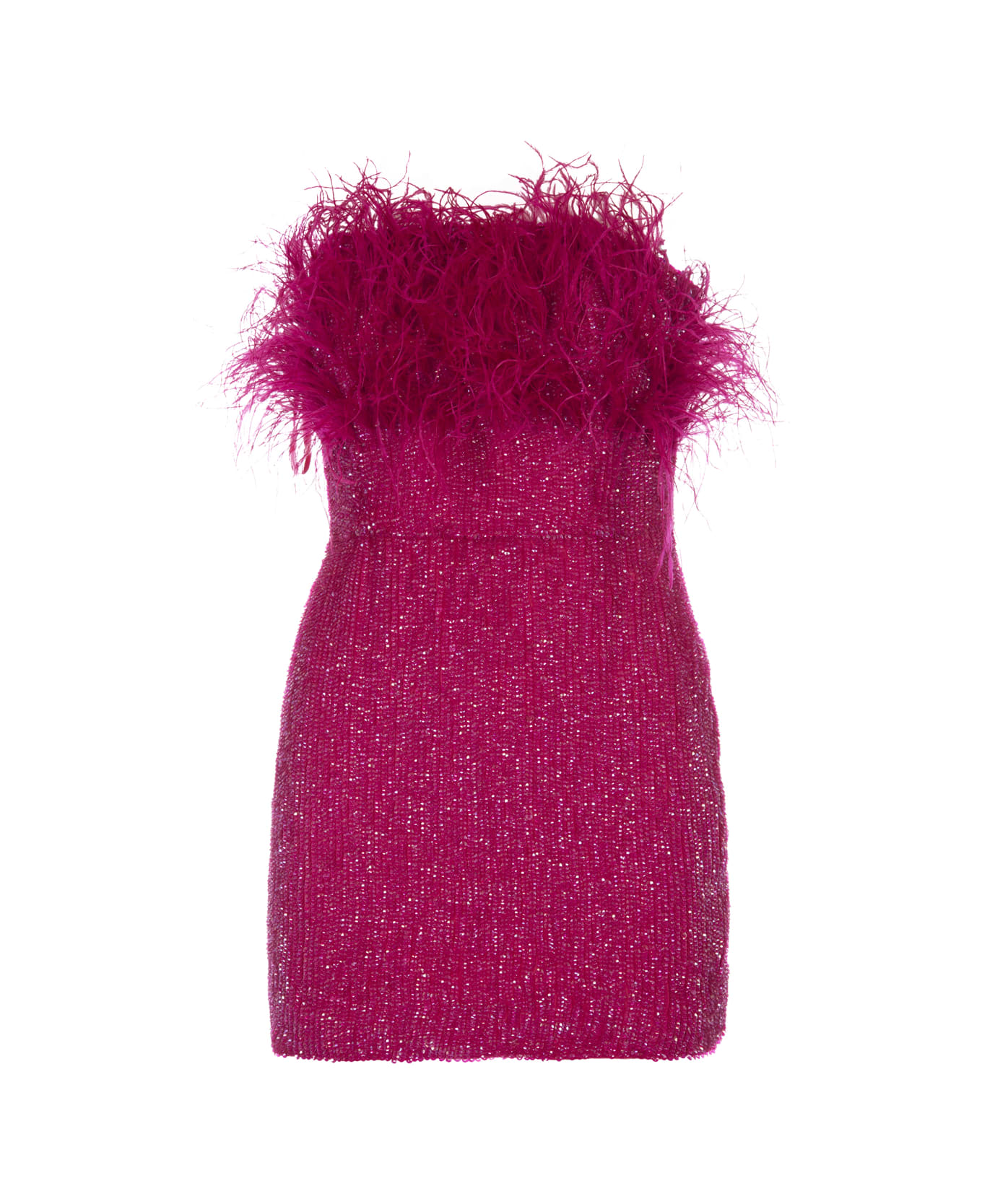 Torin mini dress by Retrofete made of Hot Pink fabric entirely covered with sequins and featuring a strapless neckline and a tone-on-tone feather trim at the top. Concealed side zip and hook fastening.