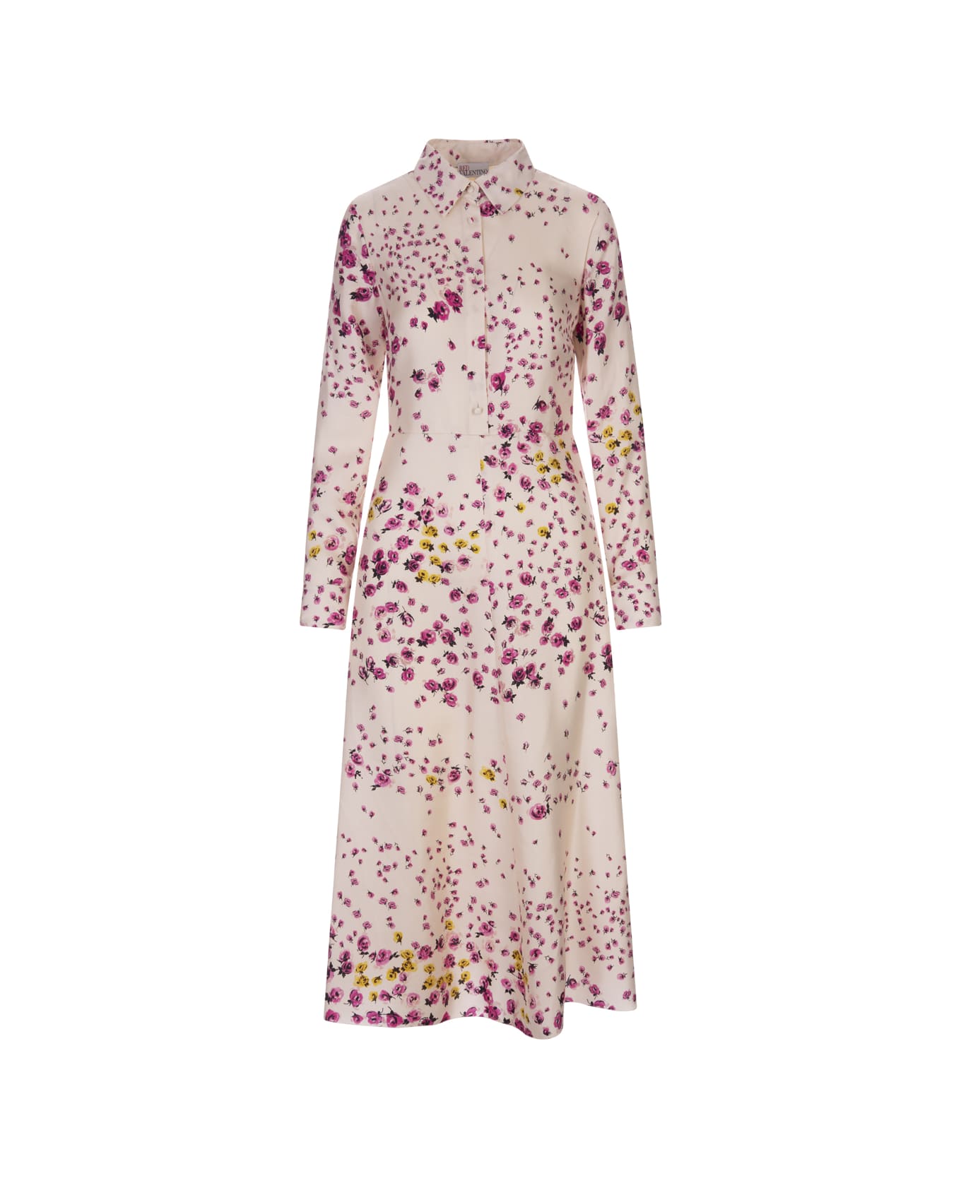 RED Valentino midi shirt dress in ivory silk with an all-over pink floral print. The design features a classic collar, long sleeves, buttoned cuffs, a flared skirt and a side zip fastening. Regular fit. Composition: 100% Silk