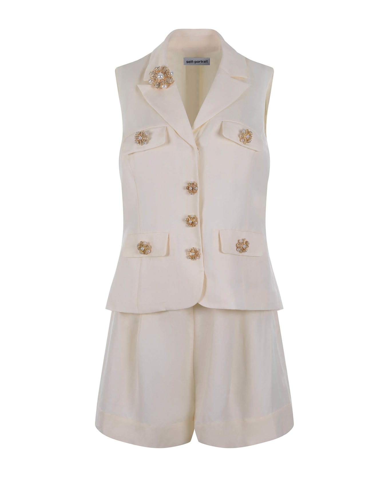 Jumpsuit Self-Portrait made of Cream linen. Lapel collar. Sleeveless. Flap pockets on the chest. Snap button closure. Flap pockets on the sides. Jewel buttons, in Gold metal. Side zip closure. Lined. Lining 100% Polyester 61% Viscose, 34% Linen Size Scale UK SIZE 4 6 8 10 12 14 16 IT SIZE 36 38 40 42 44 46 48