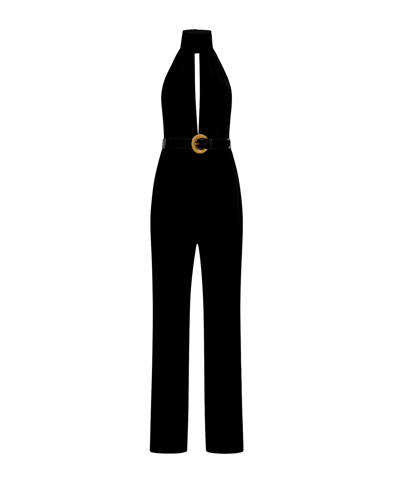 Composition: Concealed Zip Fastening On The Back Of The Trousers And Hooks On The Back Of The Neck High Collar; Open Back Cut-out On The Chest Black Patent Belt With Vintage Gold Metal Buckle Palazzo Trousers Colour: Black Outer: 66% Viscose, 31% Cupro, 3% Elastane; Lining: 92% Silk, 8% Elastane; Leather Belt Made In Italy
