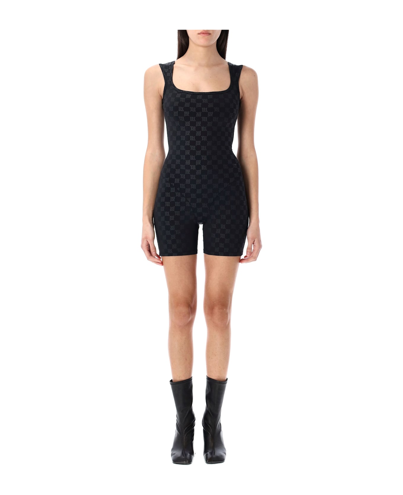 Monogram Short Bodysuit By Misbhv. Featuring: Square Neckline Sleeveless Monogram Pattern Throughout Fitted Silhouette Model Is 1,70 M And Wears Size S