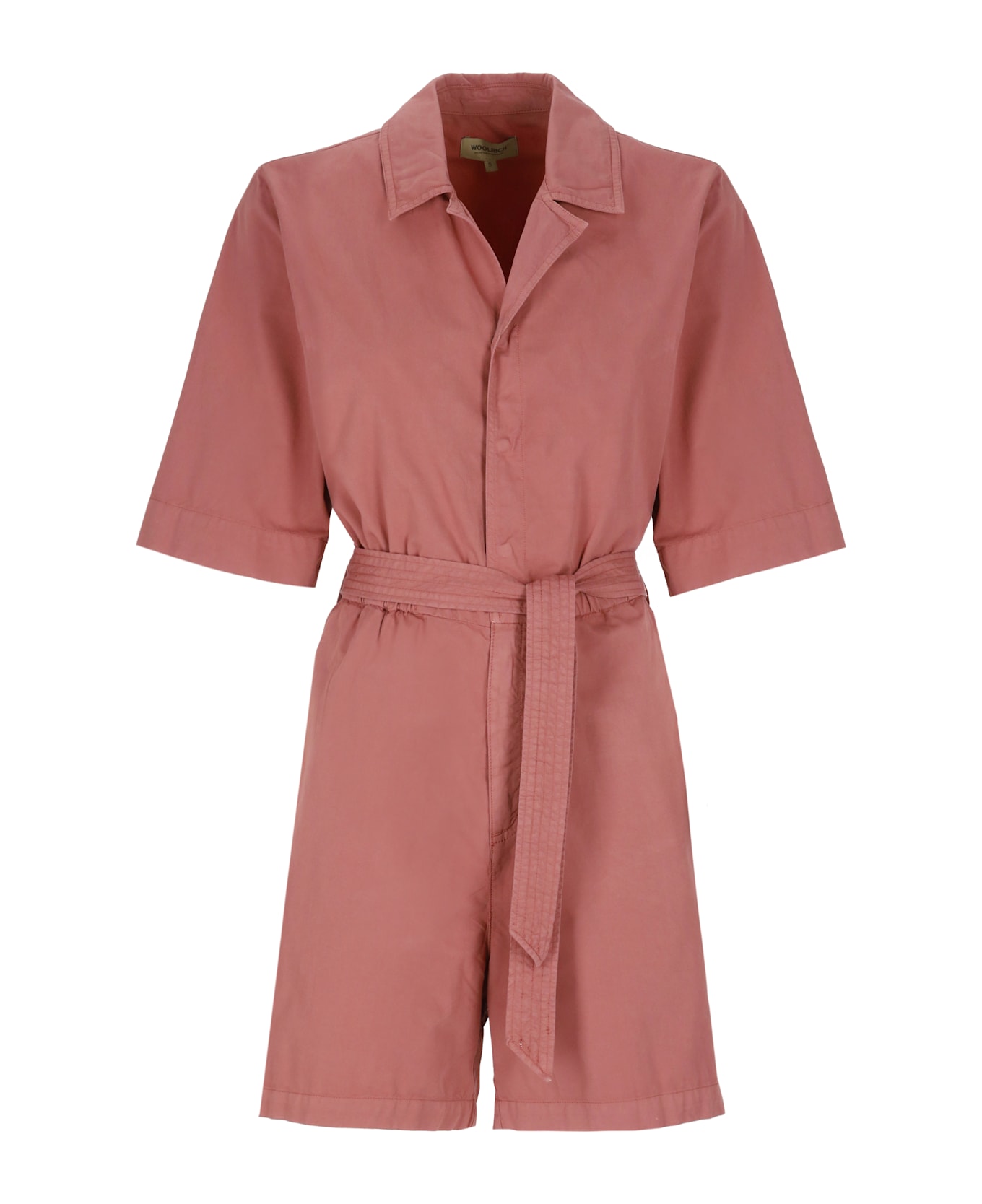 - Pink Woolrich cotton jumpsuit for woman - Collar - Short sleeves - Front buttons and zip fastening - Matching belt included - Two side slit pockets - Two rear welt pockets - Elastic at waist
