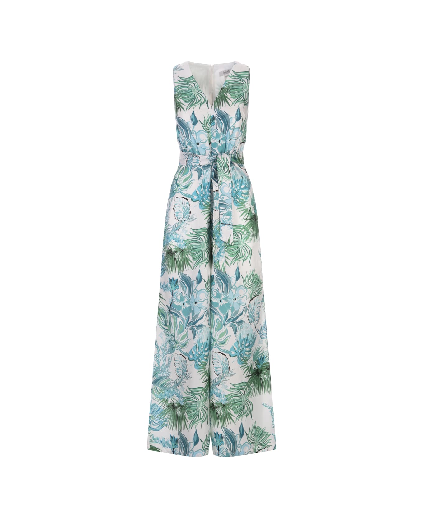Kabala jumpsuit by Max Mara made of white silk and embellished with a vibrant foliage print in shades of green and sky blue. Sleeveless model with V-neckline, palazzo trousers and concealed back zip fastening.