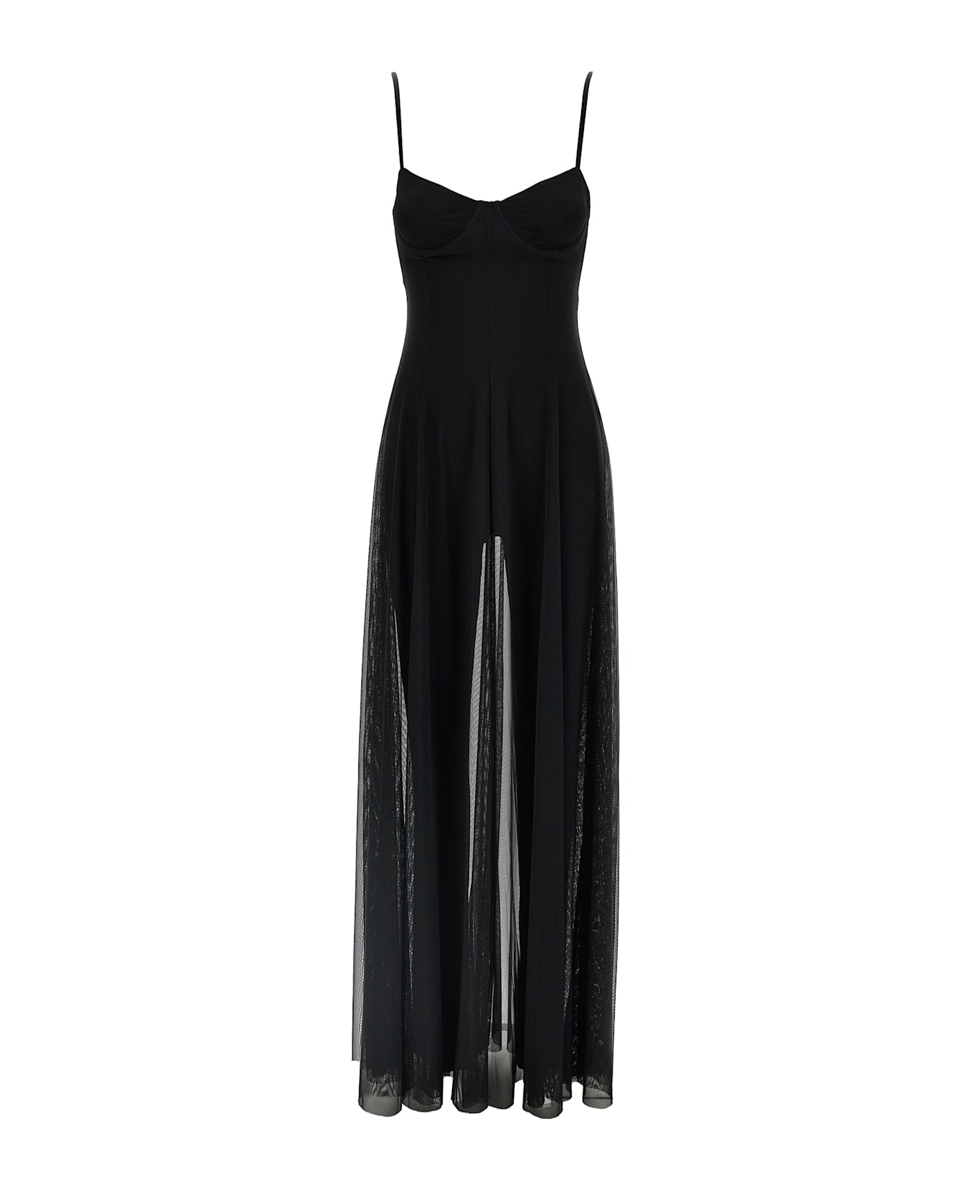 Poly lycra jumpsuit with sweetheart neckline, lightly lined cups, thin straps, sleeveless and long dress in 4-way stretch mesh overlapped semi-transparent. Composition: 95% polyester, 5% elastane