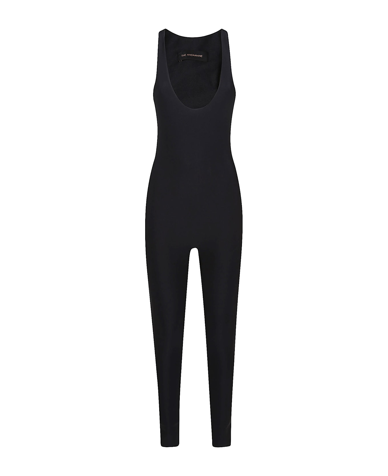 black sleeveless deep round neck tight stretch jumpsuit