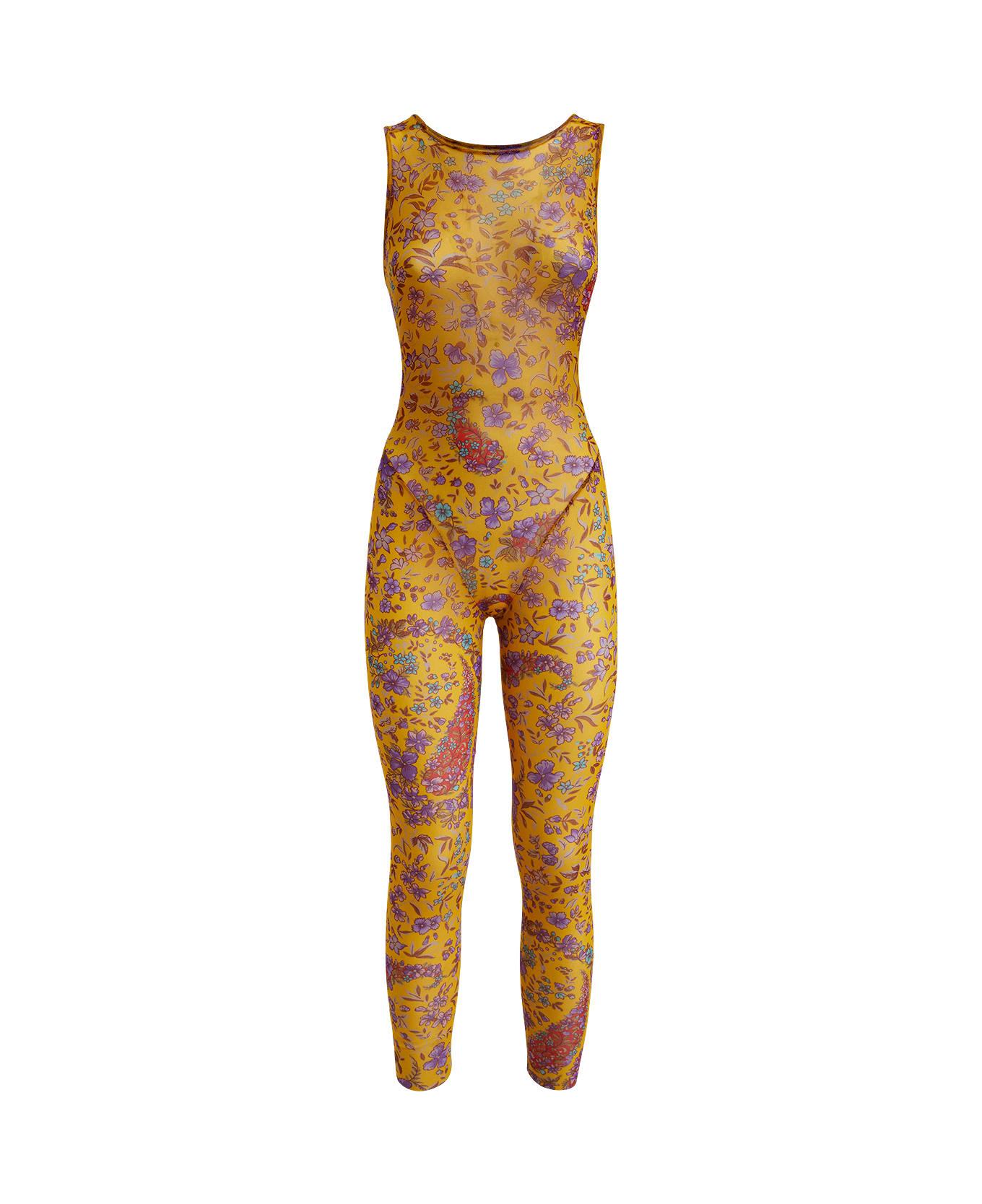 Etro sleeveless jumpsuit crafted in yellow jersey and embellished with an all-over floral Paisley print. Model with halter neckline and slim fit. Composition: 100% Polyamide
