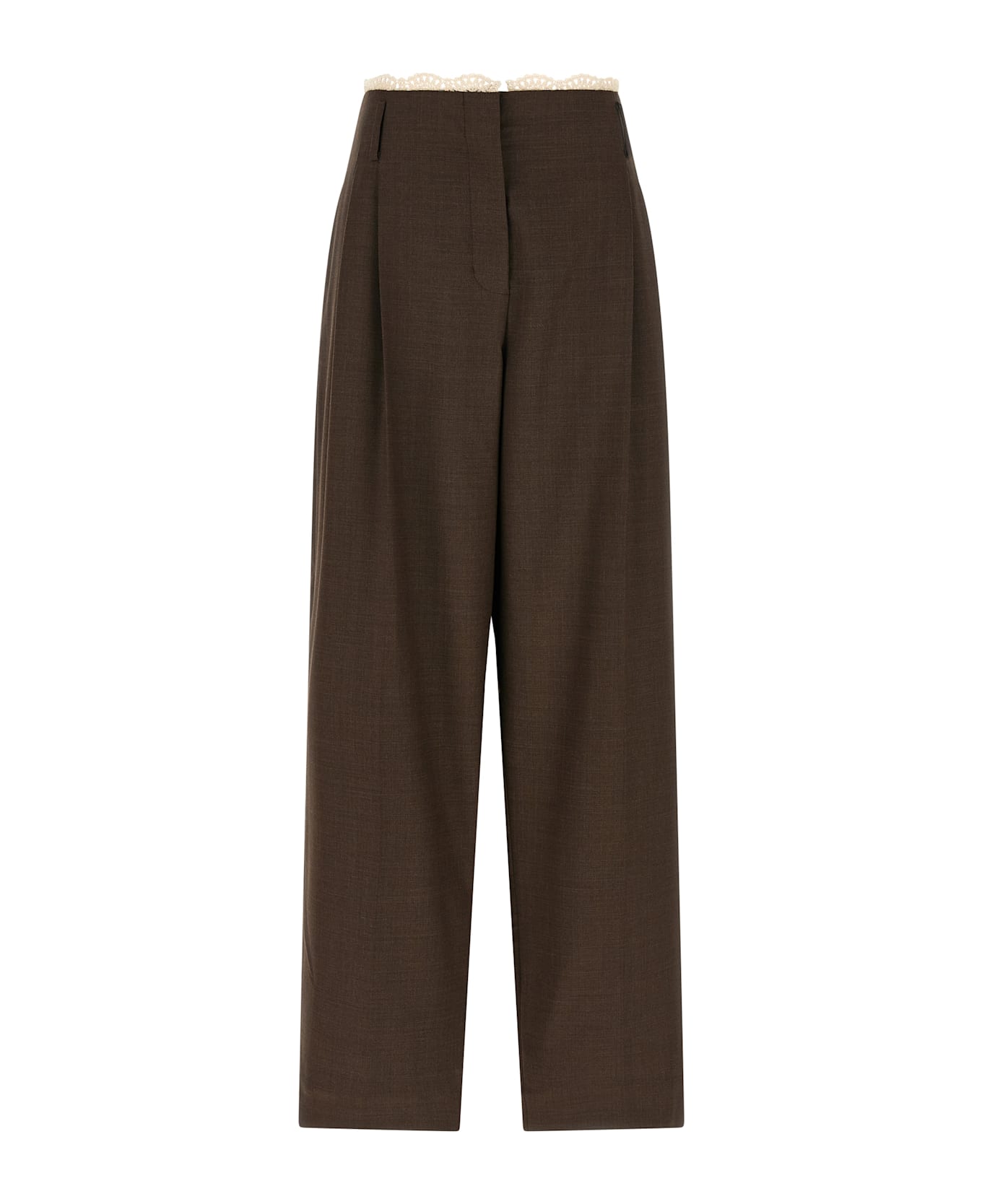 '04' wool pants, handmade crochet lace detail on the waistband, pince, stretched pleat, tapered leg, pockets, zip hook and front button closure. Composition: 98% wool, 2% elastane