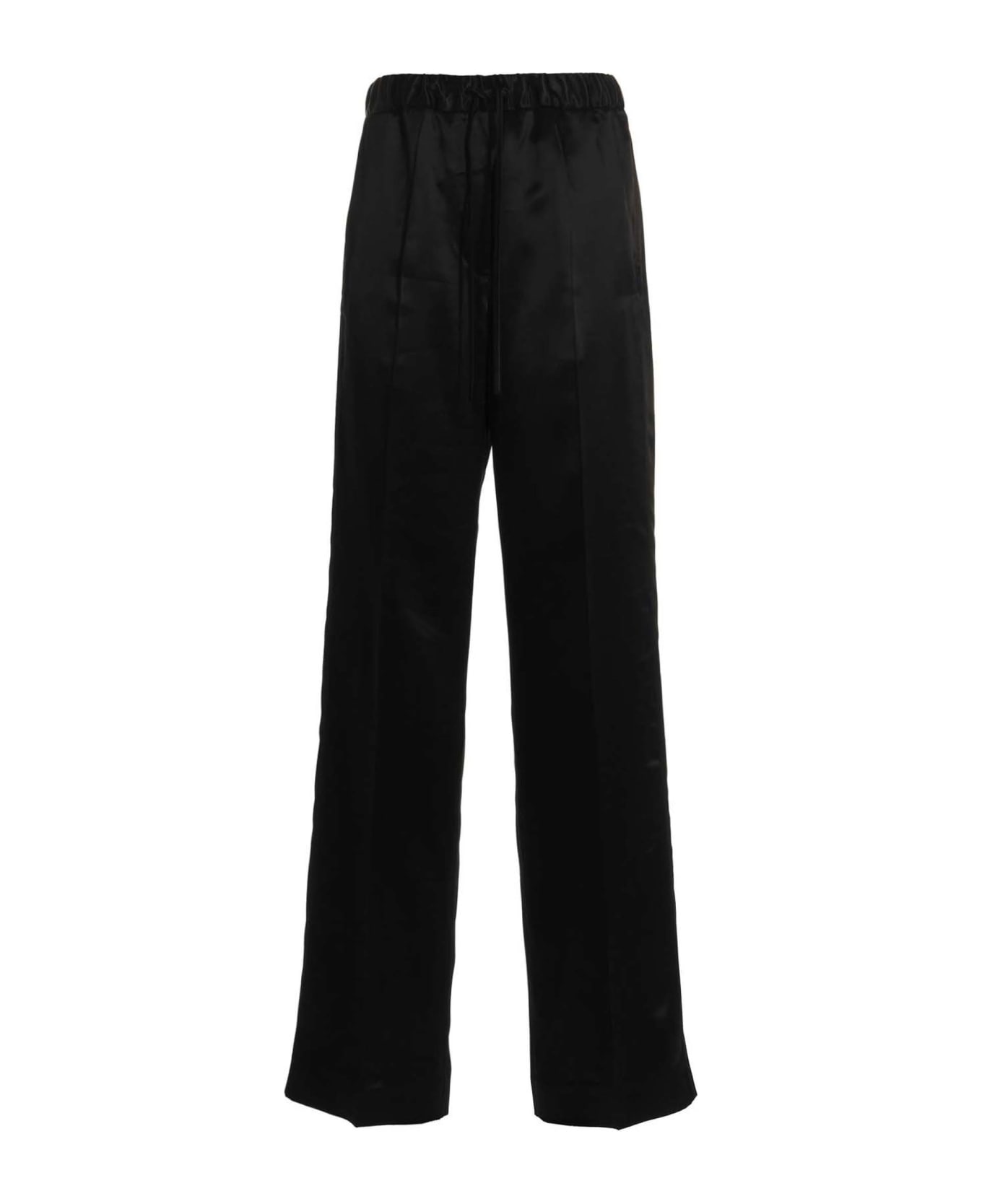 22' satin pants with elastic and drawstring at the waist, pockets, a loose leg with central crease.