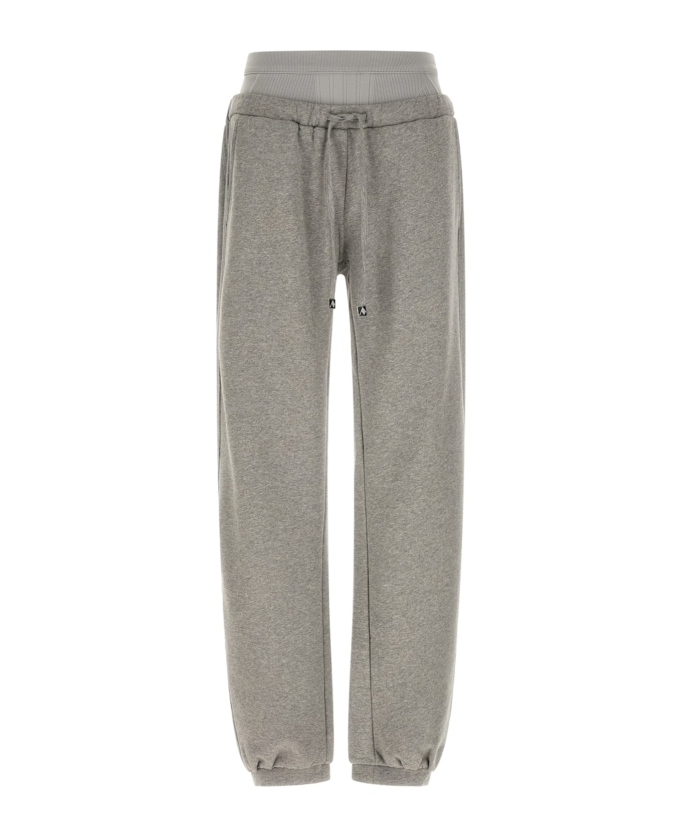 American fleece joggers with ribbed side insert, double layer detail at the waist with stretch tech fabric, wide leg, drawstring elastic waistband, pockets, tone-on-tone embroidered logo on the back, and cuffed leg bottoms. Composition: 100% cotton