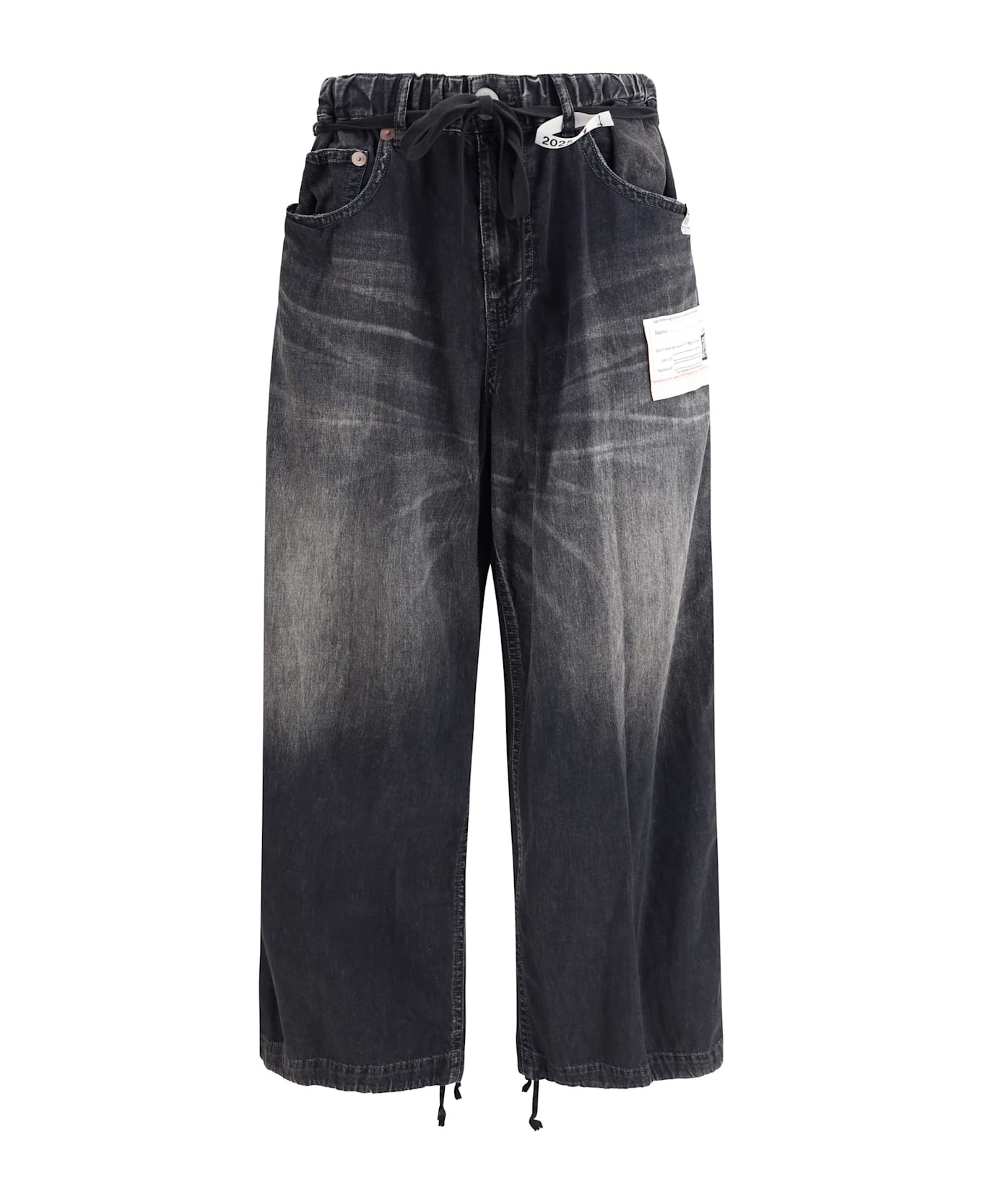 Maison mihara's cotton jeans are a modern, comfortable style with a baggy pattern and five-pocket construction. the elasticated waistband with drawstring ensures a comfortable and adjustable fit. the front closure features a zipper and button, adding a practical and stylish touch. an iconic monogram patch is applied to the front, giving the jeans a distinctive and recognizable look. perfect for those seeking a balance between casual comfort and refined style.