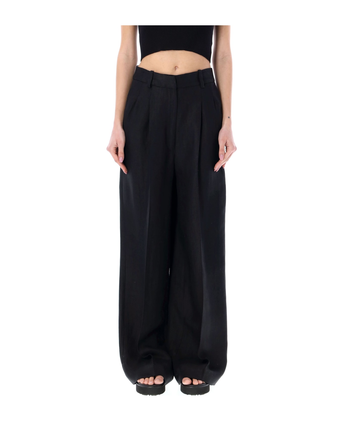 Linen-blend Balsas Pants By Loulou Studio. Featuring: High Waist Concealed Hook And Zip Fastening Slit Pockets Pleated Front Rear Welt Pockets Wide Legs With Central Crease Model Is 1,72 M Tall And She Is Wearing Size S