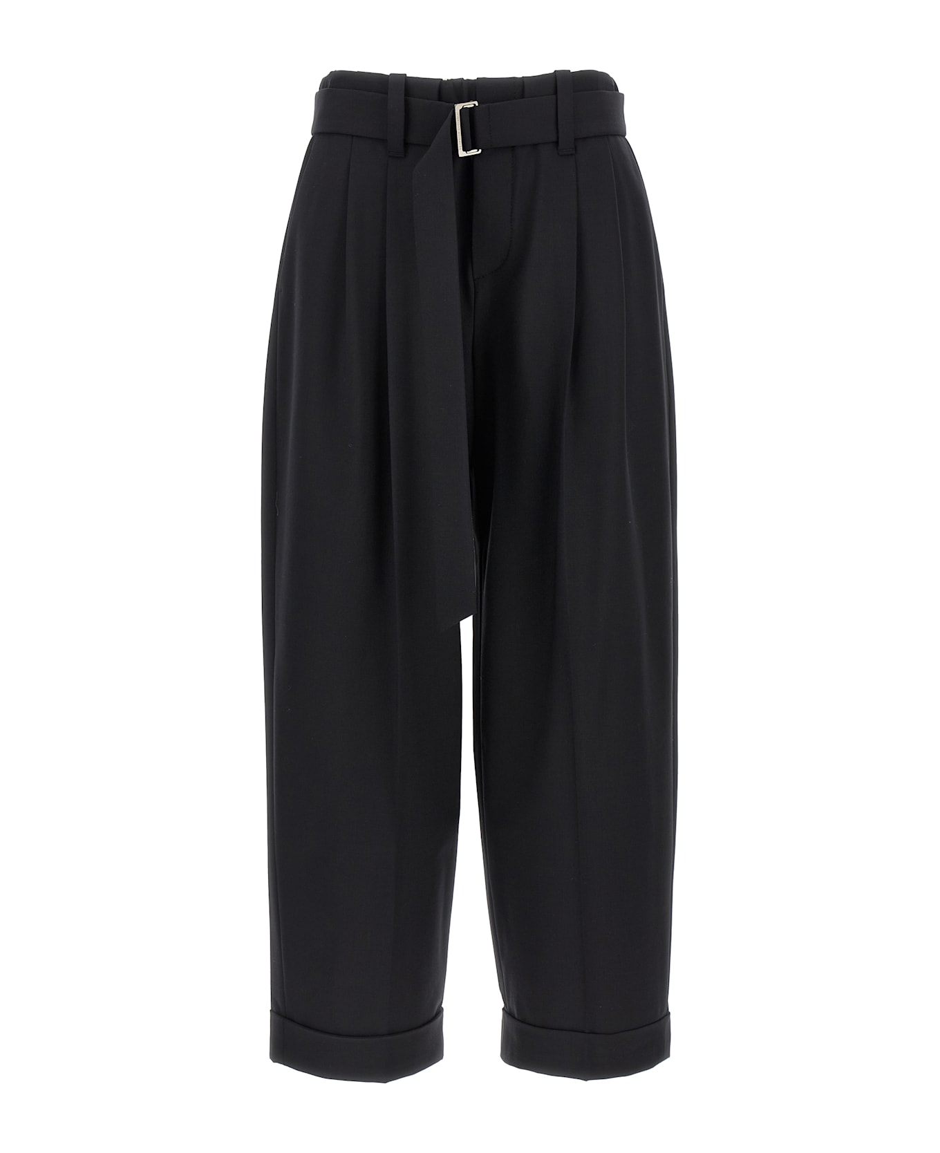 Stretch wool blend pants, pleats, stretched pleat, wide leg, front zipper hook and button closure, elastic waistband, pockets, turn-up hem, removable belt. Composition: 75% wv, 23% pa, 2% ea